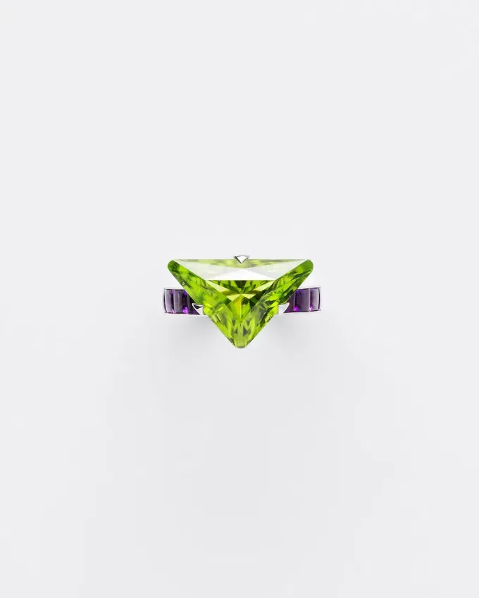 Prada ファインジュエリー「クーレール・ヴィヴァンテ」コレクションは、絶対的な色彩、彫刻的なライン、そしてコントラストを探求しています。その卓越した色彩価値から選ばれたペリドットとアメジストが、このソリテールリングのデザインに組み合わされています。このリングは、ユニークで革新的な形状により、石の自然な美しさを引き立てるために開発された、Prada独自のカットが施されています。 この意外性のある組み合わせは、Pradaの魂を反映した、洗練されながらも型破りな色彩表現を提案しています。