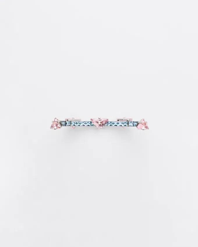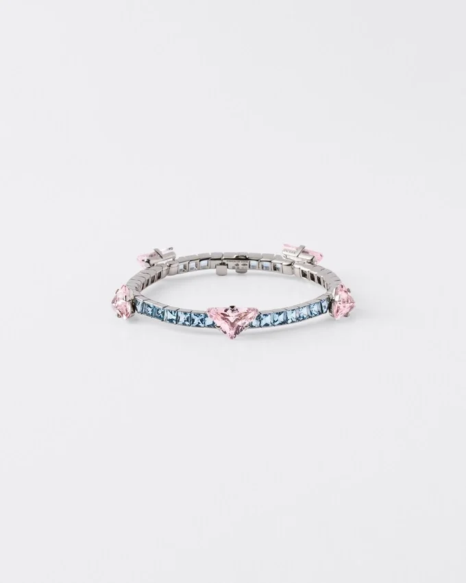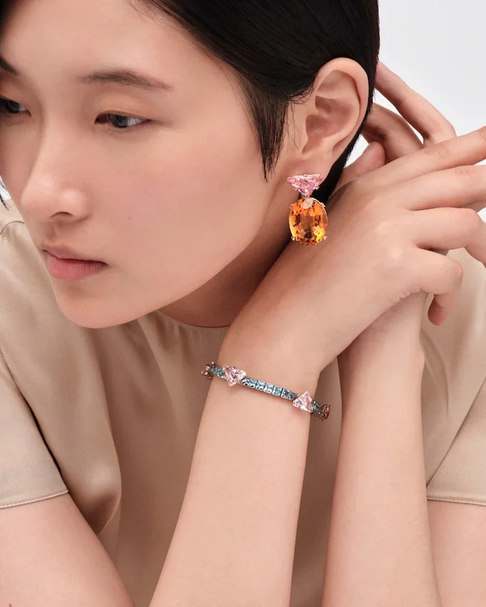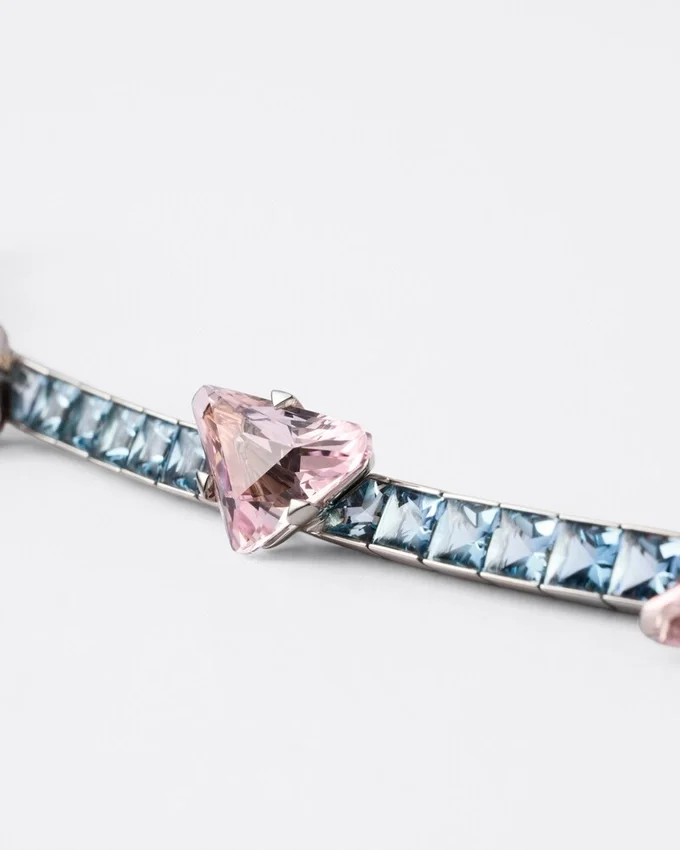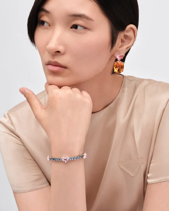 Prada ファインジュエリー「クーレール・ヴィヴァンテ」コレクションは、鮮やかな色彩、彫刻的なライン、そしてコントラストを探求しています。この探求は、クラシックなジュエリーの再発見に反映されており、それがこのホワイトゴールドのブレスレットのデザインにインスピレーションを与えています。ここでは、アクアマリンが、Prada特有のカットによって引き立てられたピンクモルガナイトの輝きと出会います。