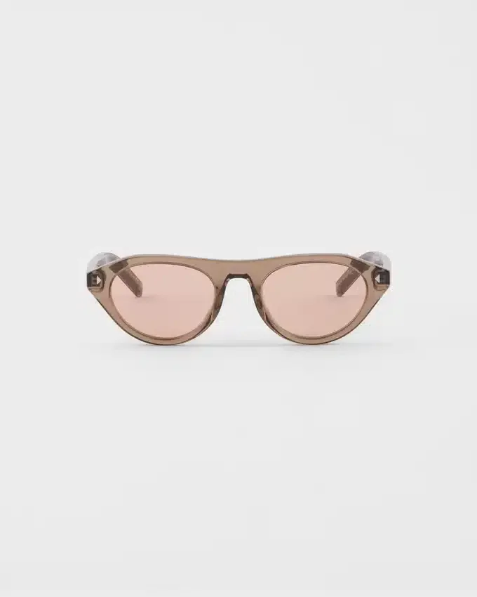 洗練された美学と細部へのこだわりが融合した、Pradaの新しいサングラスです。アセテート製のフロントには洗練された三角形のリベットがあしらわれ、テンプルにはPradaのロゴが刻まれた象徴的なメタルパーツが際立っています。
