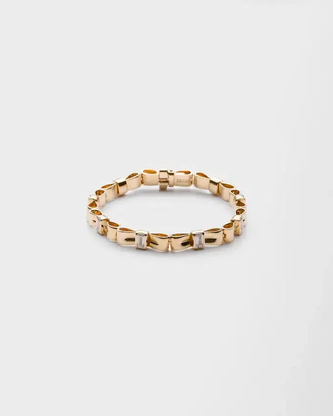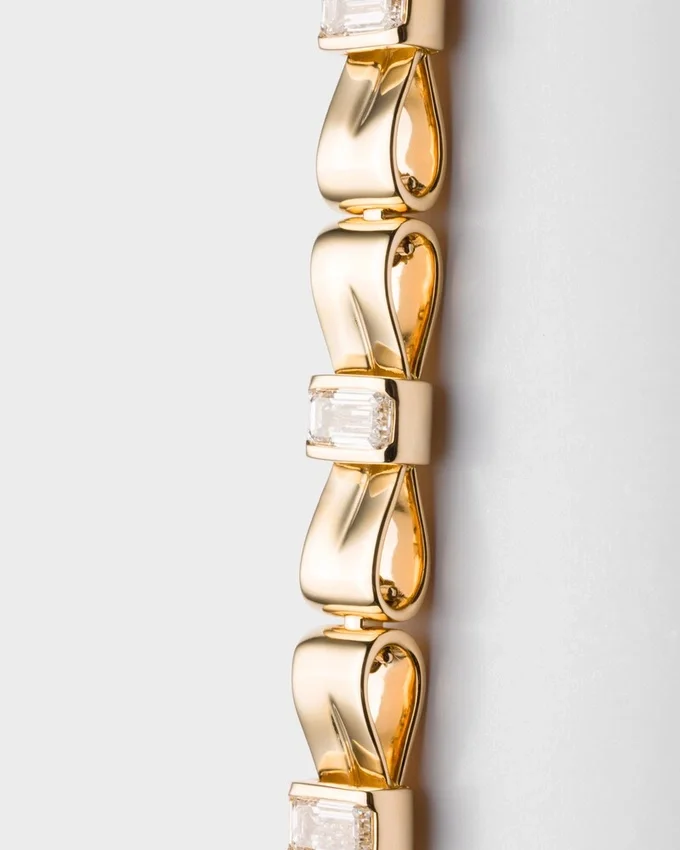 ジュエリーの原型を再発見する旅は、永遠かつ繊細なSymboleである「リボン」を、最もシンプルな形で現代的に解釈したこの作品へと続きます。この可動式のゴールドブレスレットは、リサイクルイエローゴールドを使用し、クリーンでエレガントなデザインに仕上げられ、ラボラトリー・グロウン・ダイヤモンドが輝きを添えています。 (18K) ラボラトリー・グロウン・ダイヤモンド付き