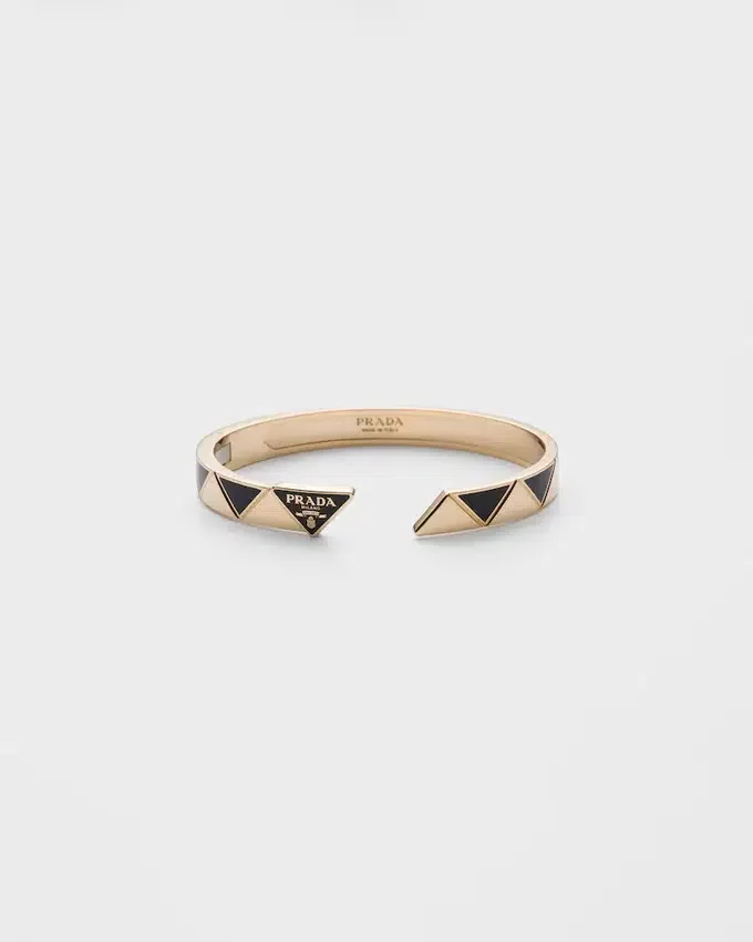 Pradaのシグネチャーである「トライアングル」が、ファインジュエリーコレクションのために新たに生まれ変わりました。1913年にマリオ・プラダの旅行用トランクに刻印として初めて登場したトライアングルが、現代的なアクセントを添えたこのオーバルバングルブレスレットで際立っています。 この象徴的な幾何学模様を彷彿とさせるモチーフで装飾されたブレスレットは、ゴールドとブラックセラミックのモダンな色彩のコントラストが特徴で、その汎用性が高くモダンなスタイルを際立たせています。