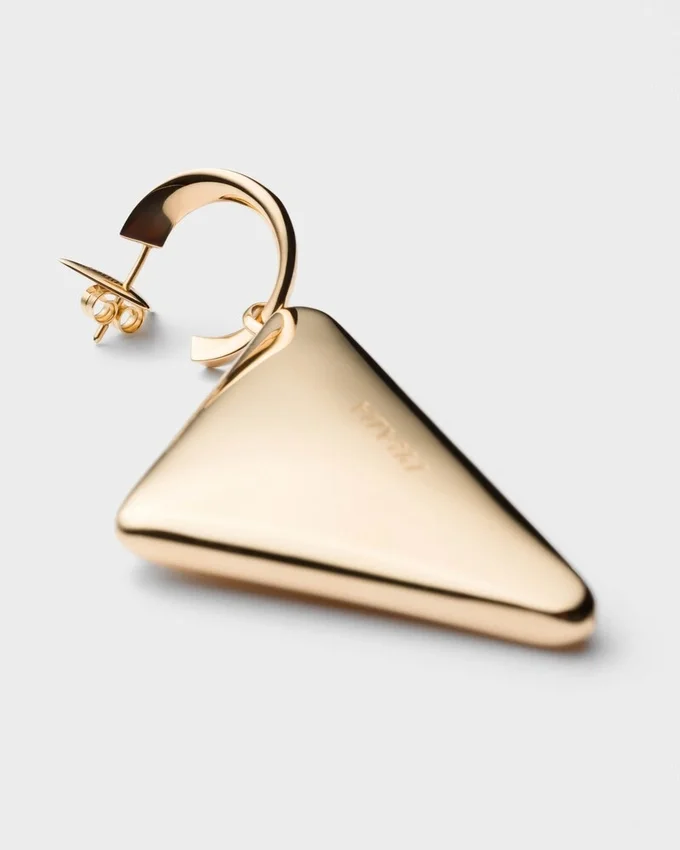 Pradaのシグネチャーであるトライアングルが、ファインジュエリーコレクションの主役となります。1913年にマリオ・プラダの旅行用トランクに刻印されたホールマークとして初めて登場したこのモチーフは、リサイクルイエローゴールドで作られたこのイヤリングにおいて、大胆かつ滑らかなフォルムで再解釈されています。