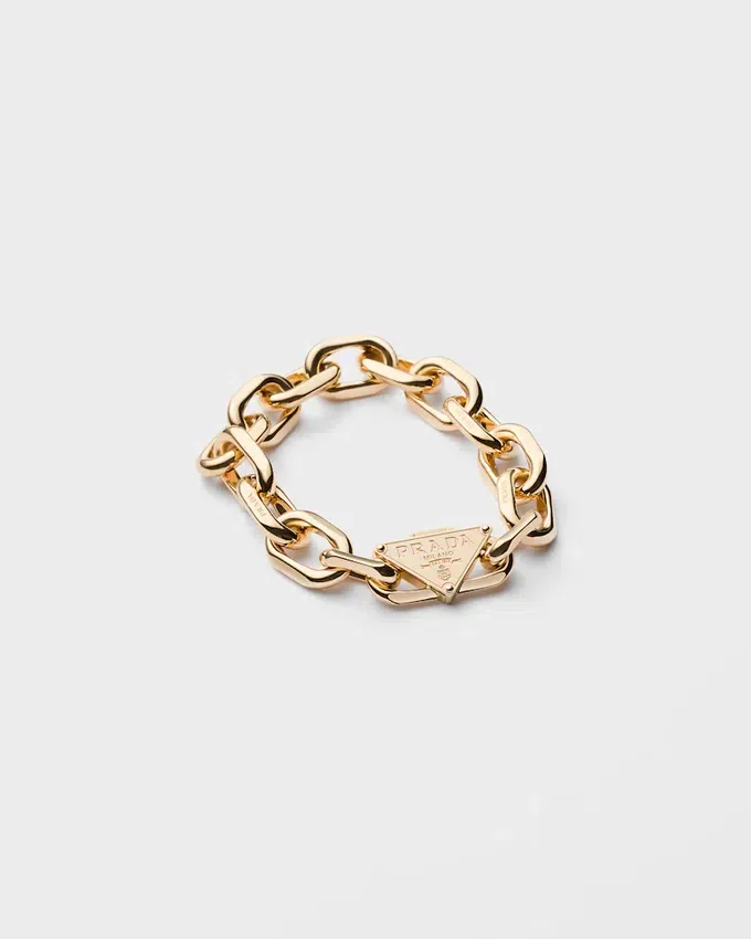 Pradaのアーカイブに由来するチェーンのイメージは、新たな形と意味を帯びています。ファインジュエリーコレクションにおいて、このチェーンは力強さと優雅さを体現する、大胆かつ洗練されたデザインに仕上げられています。 リサイクルイエローゴールド製のこのブレスレットの各リンクは、両面が面取りされており、Pradaの象徴的な「Cleo」バッグの底面から着想を得た、優雅な曲線を描いています。1913年にマリオ・プラダの旅行用トランクに刻印として初めて登場した象徴的なトライアングルが、プッシュボタン式のボックスクラスプを備えたこのブレスレットのチャームとして再解釈されています。