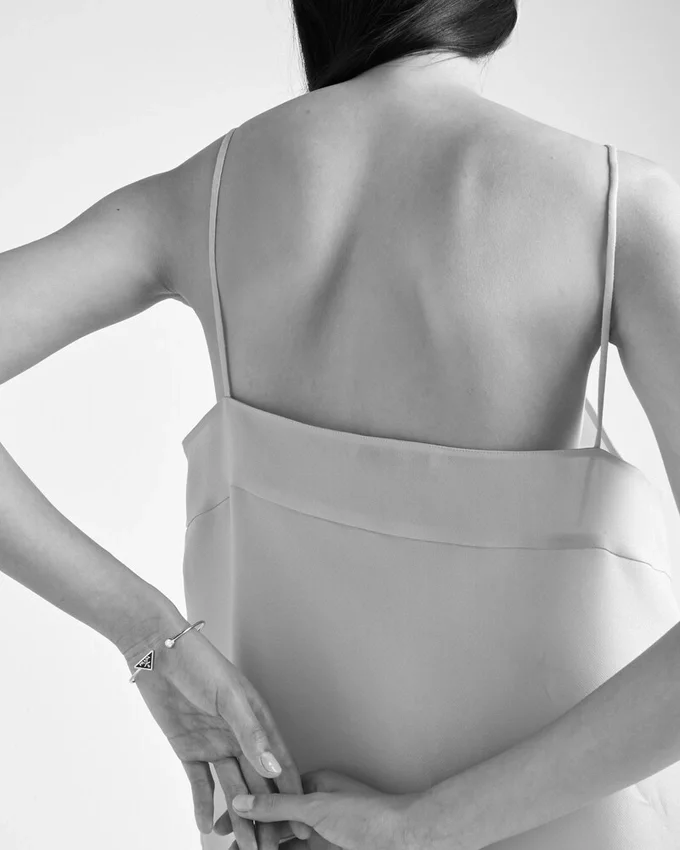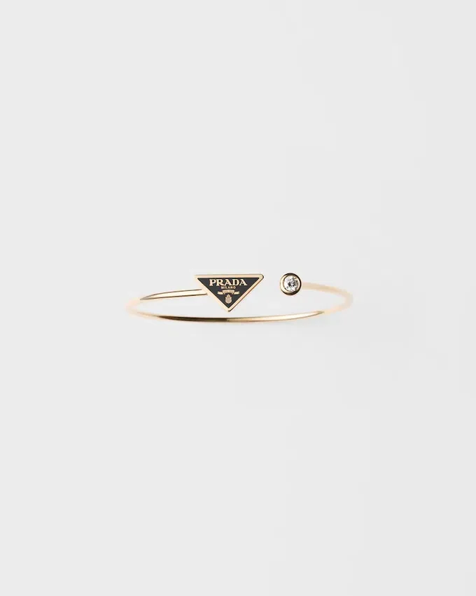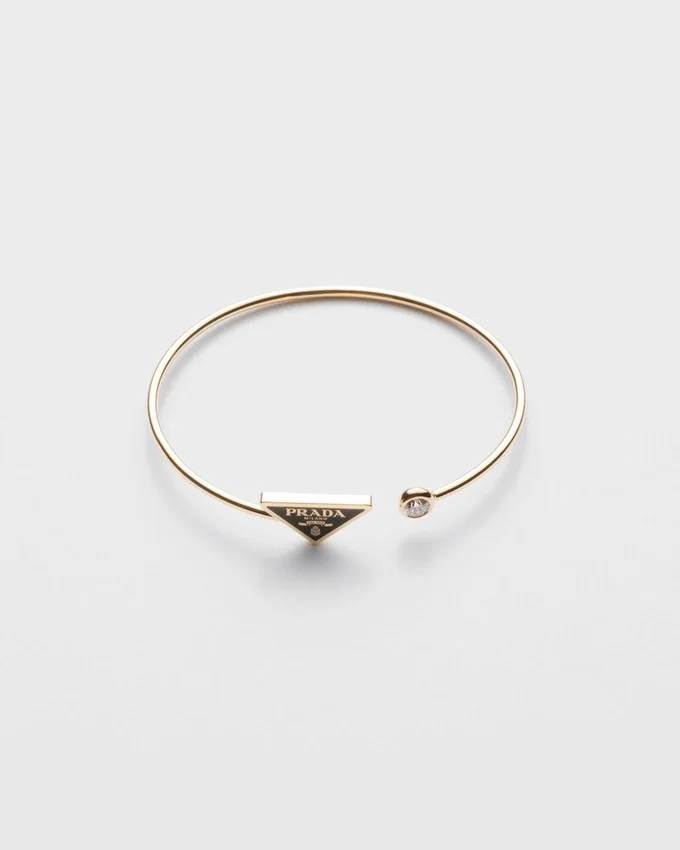 リサイクルイエローゴールドを使用した繊細なデザインのこのブレスレットでは、貴重なダイヤモンドが眩い光の戯れを生み出しています。1913年にマリオ・プラダの旅行用トランクに刻印として初めて登場した三角形が、この汎用性の高いファインジュエリーに際立っています。 単独でも、他のジュエリーと組み合わせて着用することもできるこのブレスレットは、ブランドの時代を超えた伝統と、独自性と職人の技を称えるための絶え間ない対話の中で過去と現在を融合させる能力を体現しています。