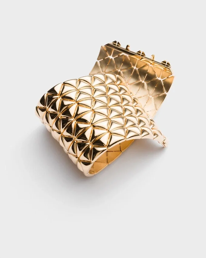 絶えず進化し続けるシンボルであるトライアングルは、Pradaの二面性と型破りな精神を体現し、常に新しく驚くべき解釈を生み出しています。1913年にマリオ・プラダによって導入されたこの象徴的な幾何学模様は、独自のカットが施されたリサイクルイエローゴールド製のこのブレスレットの構造的要素となっています。 このジュエリーは、洗練された現代的なラインでクラシックなカフブレスレットを再解釈し、彫刻のようなデザインへと昇華させています。この唯一無二の貴重な作品は、創造性、革新性、そして熟練の職人技が融合したファインジュエリーコレクションの真髄を体現しています。