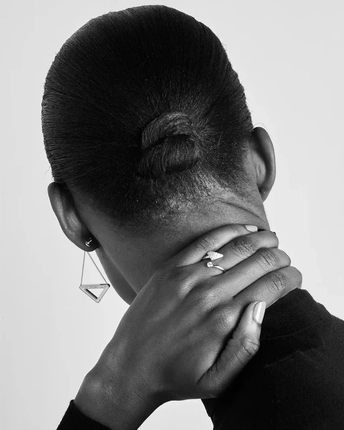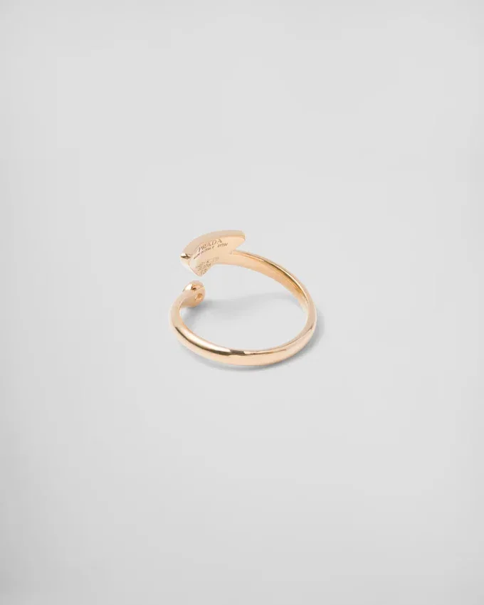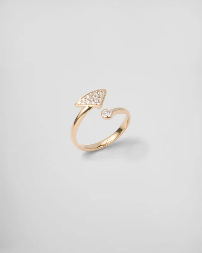 Pradaは、時代を超えた独自の表現手法を活かし、現代的な視点を通じてジュエリーのクラシックなフォルムやテーマを再解釈しています。マリオ・プラダがデザインしたトランクに初めて採用された「Prada Triangle」は、シンプルで普遍的なフォルムを通じて、独自性と現代性を表現しています。 リサイクルされた18金イエローゴールドで作られたこのリングには、ブリリアントカットのダイヤモンドがパヴェセッティングされ、輝きを放っています。