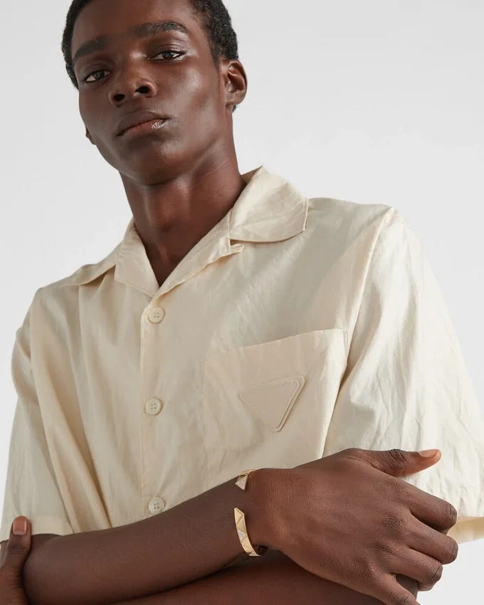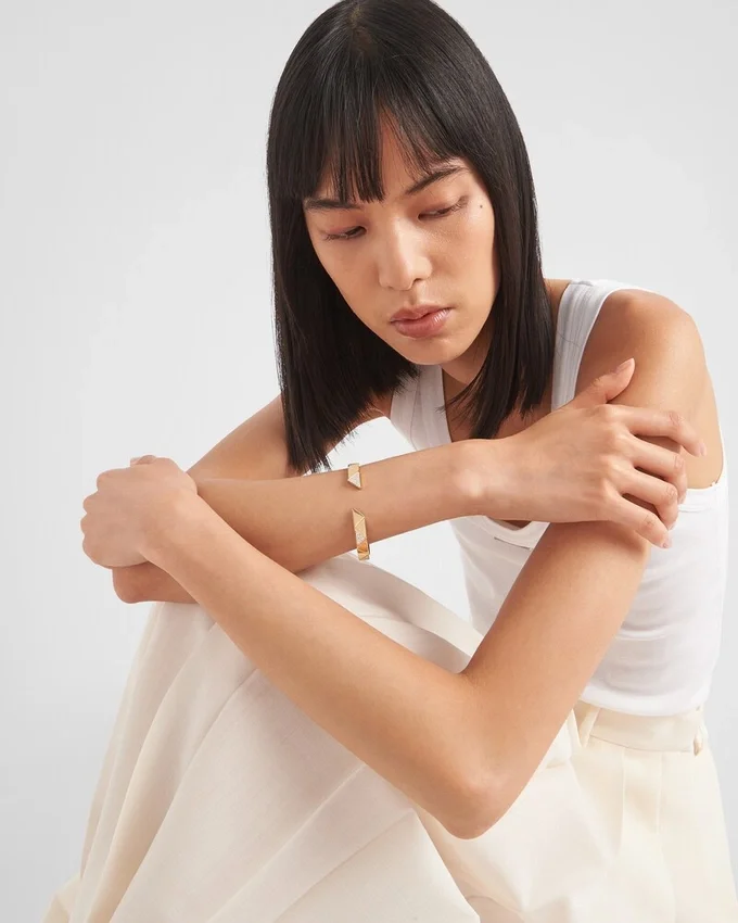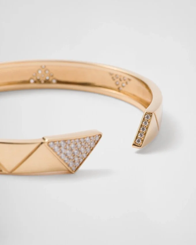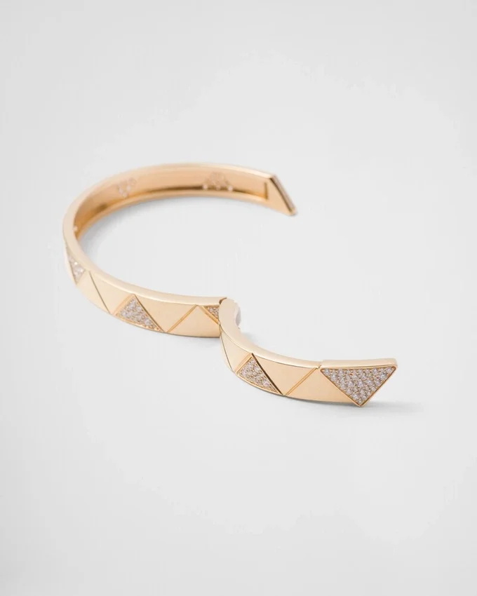 絶えず進化を続けるシンボルであるトライアングルは、Pradaの二面性と型破りな精神を体現し、常に新しく驚くべき解釈を生み出しています。 エンボス加工されたパターンへと変貌を遂げた、この象徴的な幾何学模様が、リサイクルイエローゴールドで作られたエレガントなバングルブレスレットの特徴です。このスタイルは、クラシックなバングルのデザインを再解釈し、きらめくパヴァダイヤモンドで彩られ、隠し留め金機構によって完成されています。