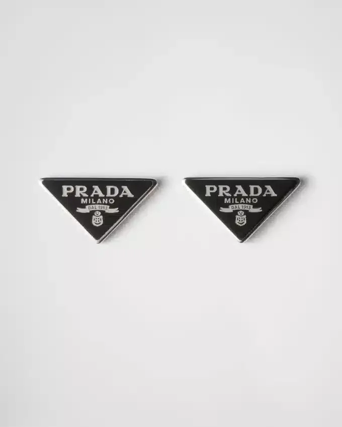 Prada Triangleロゴが持つ、象徴的で洗練された幾何学的な形状が、このエナメル加工シルバーイヤリングに独特のデザインを際立たせています。