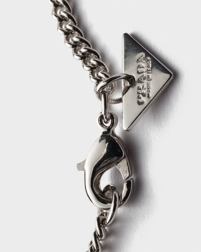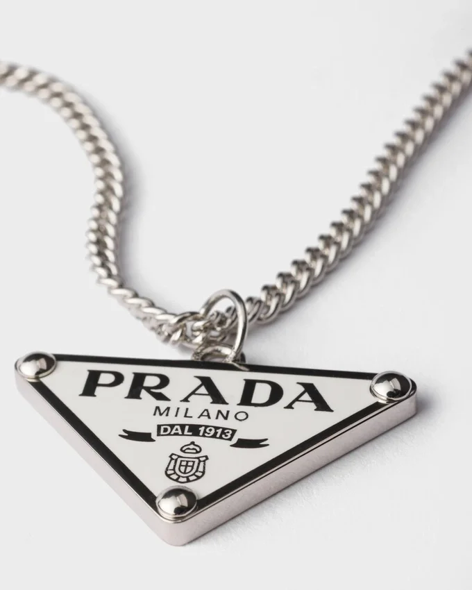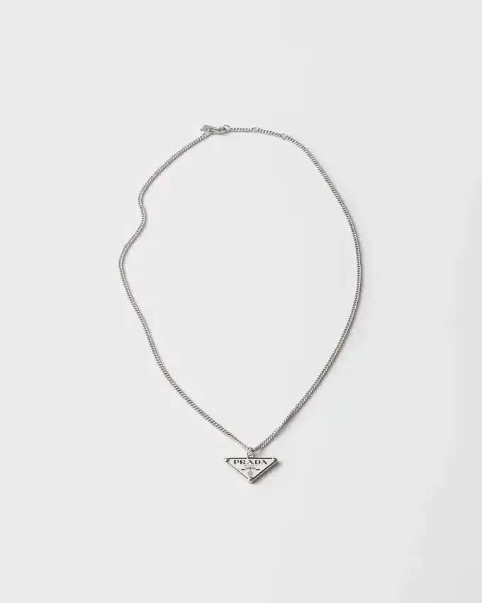 象徴的なエナメル加工メタル製トライアングルロゴが、このネックレスにモダンな個性を添えています。