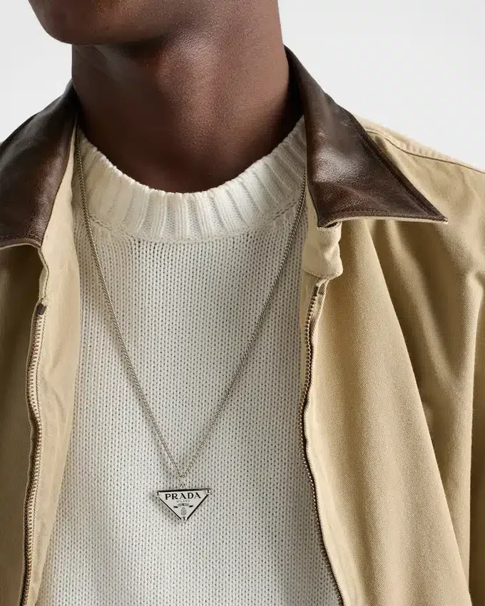 象徴的なエナメル加工メタル三角ロゴが、このネックレスにモダンな個性を添えています。