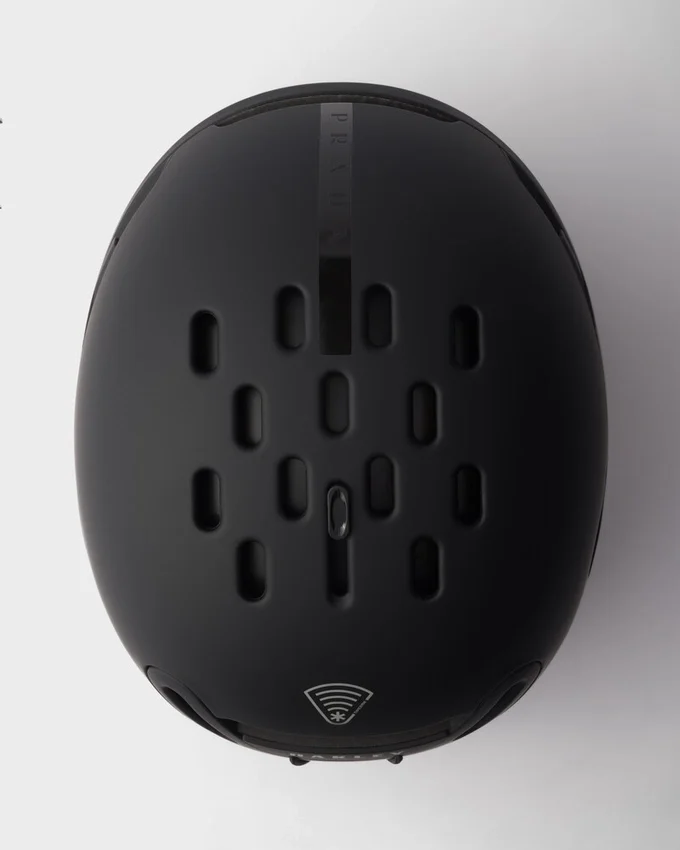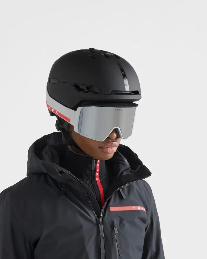 取り外し可能なライナー。ヘルメットには、アイコニックなプラダ リネア・ロッサのロゴが同系色で施されています。