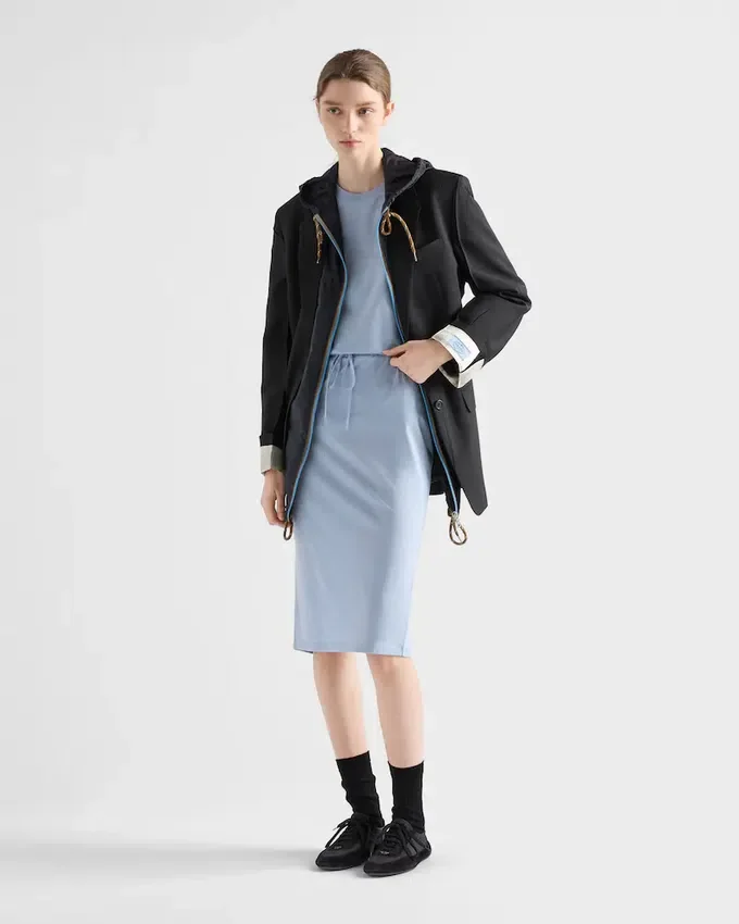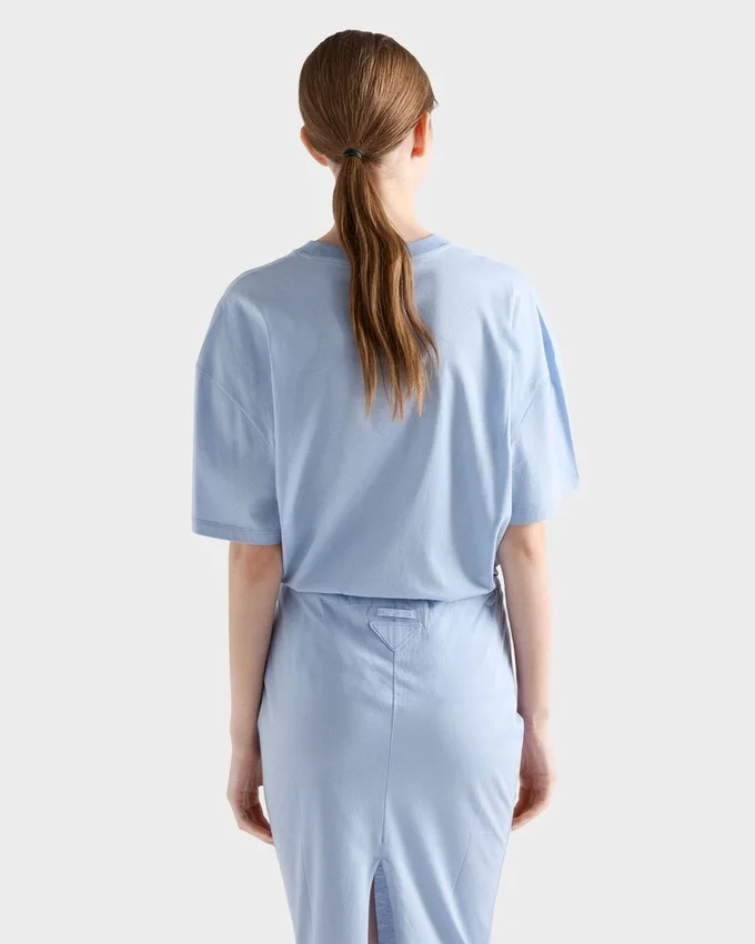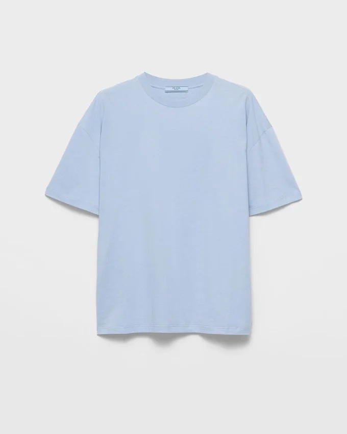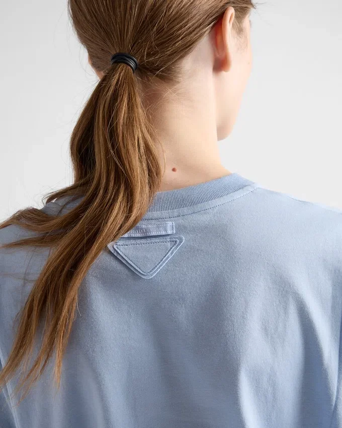 PradaのジャージーTシャツは、ブランドの定番アイテムであり、シンプルさの中に贅沢さを体現しています。それは一種の姿勢となり、ベーシックなアイテムを再発明し、新たな意味を提案する探求そのものです。