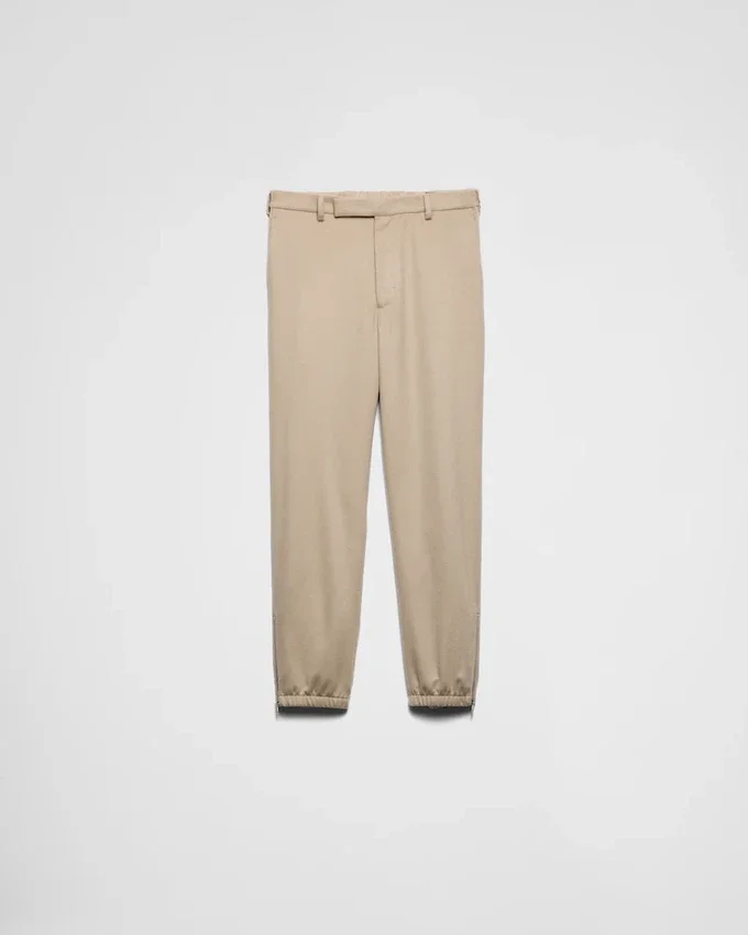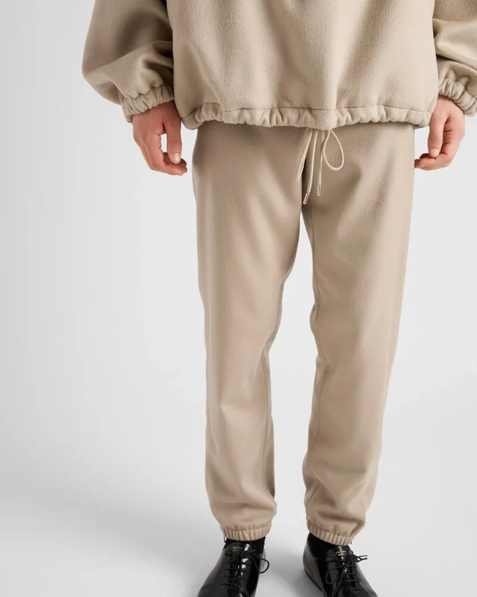エレガントな仕立てとスポーティなスタイルを融合させたハイブリッドシルエットのソフトカシミアパンツには、三角形のロゴによる象徴的な幾何学模様が施されています。