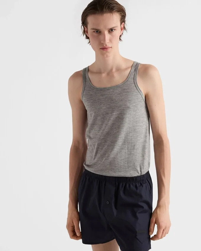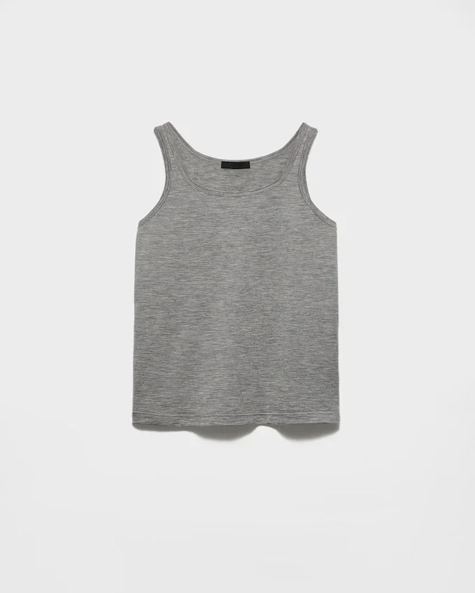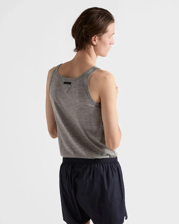 上質なカシミアとシルクのブレンドが、このタンクトップに軽やかで快適な肌触りと洗練された印象を与えています。スリムフィットのシルエットには、同系色のトライアングルロゴがあしらわれています。