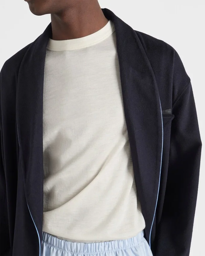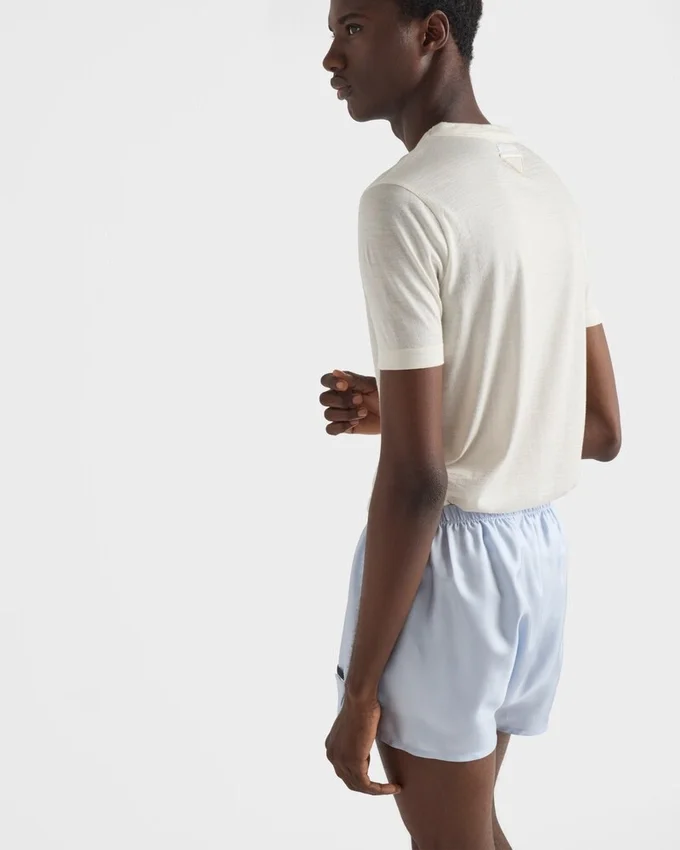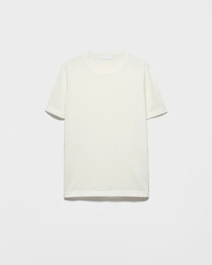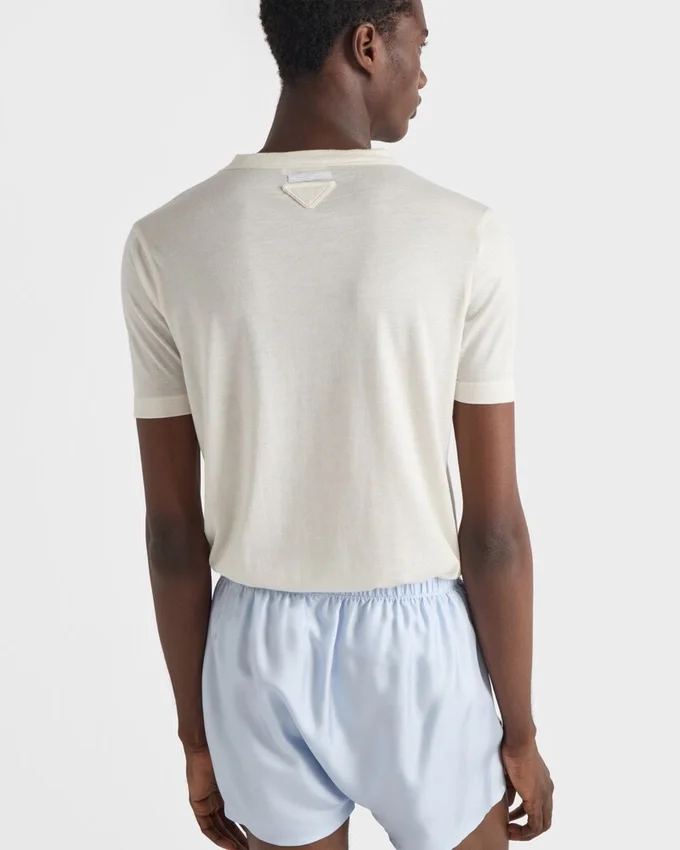 上質なカシミアとシルクのブレンドにより、このTシャツは暖かく軽量な質感と洗練された印象を与えます。スリムフィットが特徴の半袖シルエットには、同系色のトライアングルロゴがあしらわれています。