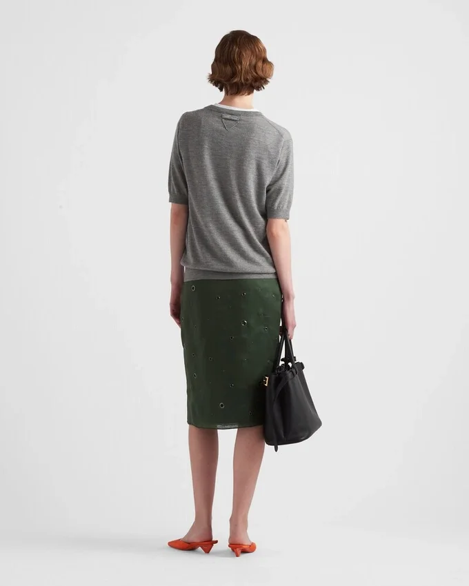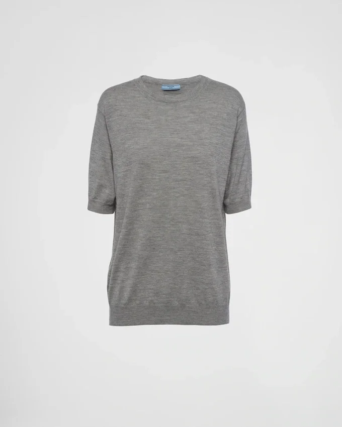 この洗練されたミニマルなクルーネックセーターは、上質で柔らかなカシミアを使用したプレーンニットです。メンズウェア風のフィット感を持つ汎用性の高いスタイルで、リブ編みのトリムが施されています。また、サルトリアルラベルとニットの三角ロゴが、個性的でありながらシンプルなアクセントを加えています。