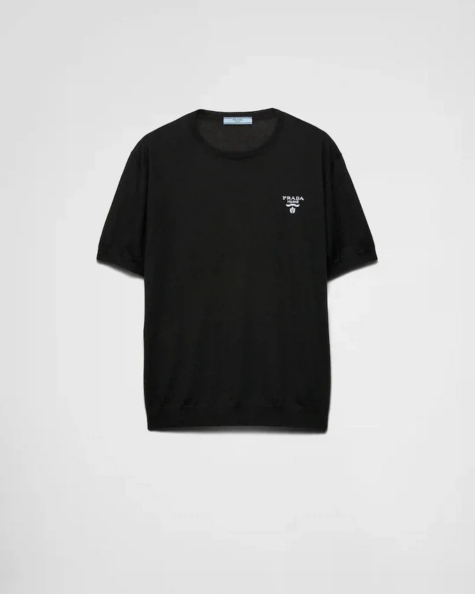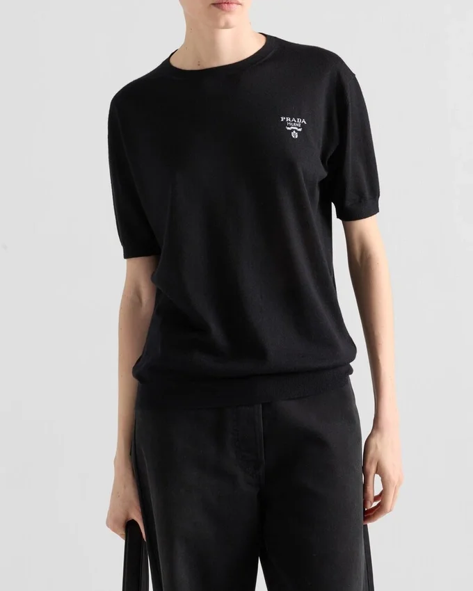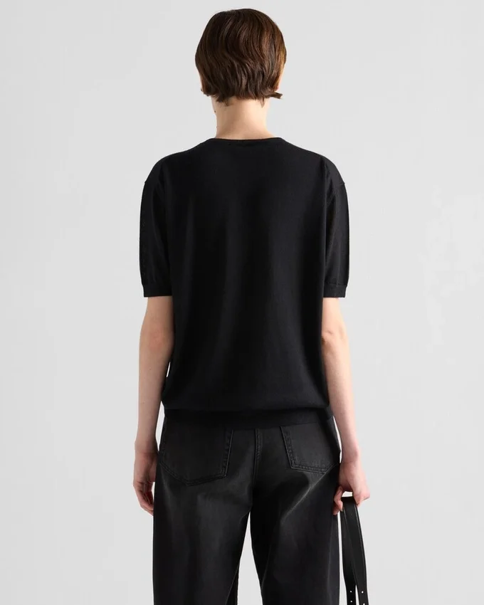 クラシックなクルーネックデザインが特徴の無地カシミヤセーターです。クルーネック、袖口、裾を縁取るリブ編みのモチーフが、オーバーサイズのシルエットを引き立てています。フロントにはインタルシア刺繍のロゴが際立ち、アイテムを彩っています。
