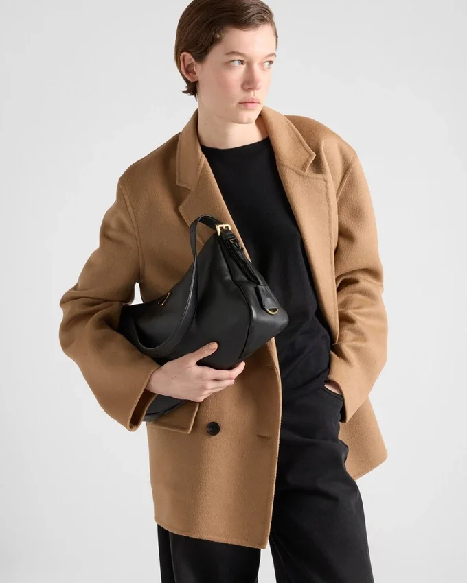 この無地ニットのカシミヤセーターは、クラシックなクルーネックデザインが特徴です。クルーネック、袖口、裾を縁取るリブ編みのモチーフが、オーバーサイズのシルエットを引き立てています。フロントにはインタルシアのレタリングロゴが際立ち、セーターを彩っています。