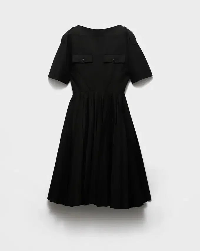二つのエッセンスが融合したこのドレスのデザインには、意外性のある組み合わせとコントラストが息づいています。柔らかくフェミニンなボリューム感を持つレトロなシルエットは、ガバディン生地とクチュール仕立てで構成され、実用的なディテールで仕上げられています。エレガンスと機能性、厳格さと華やかさの絶妙なバランスが特徴です。