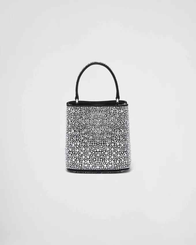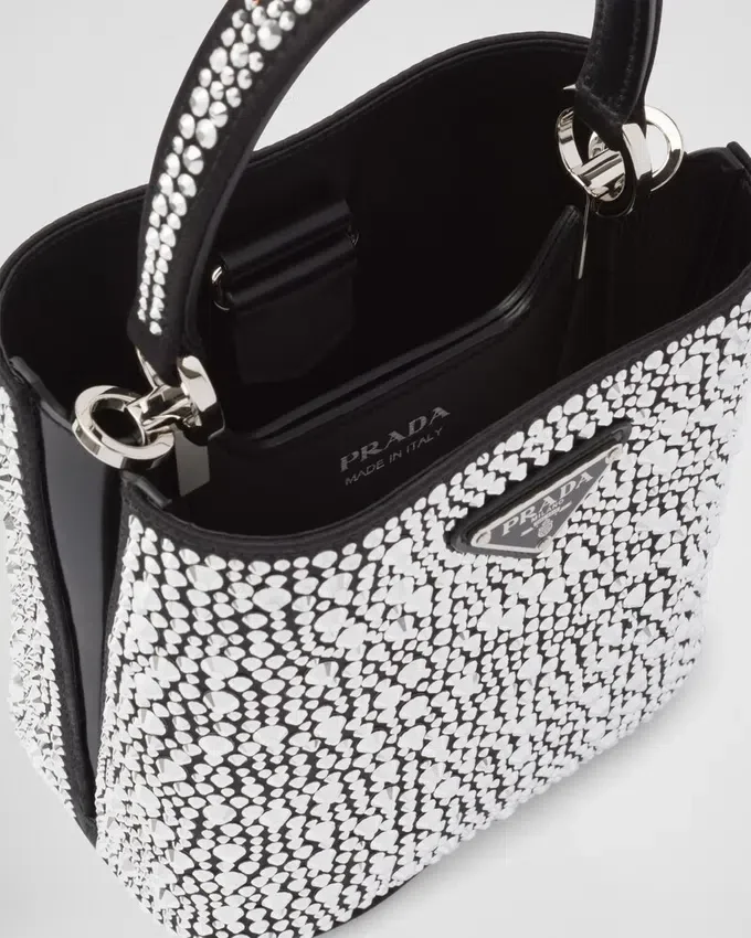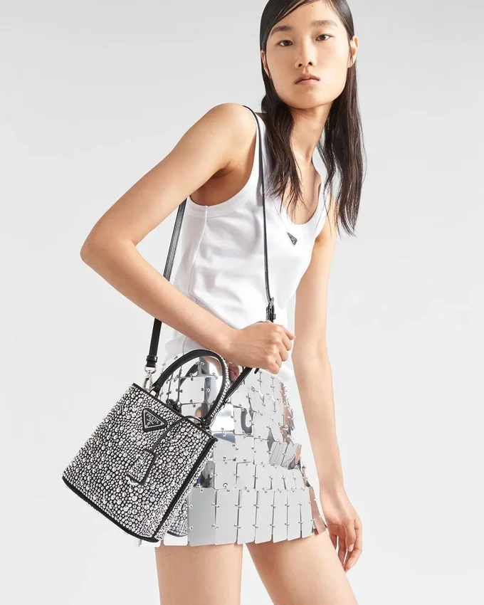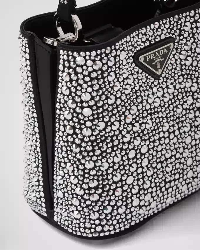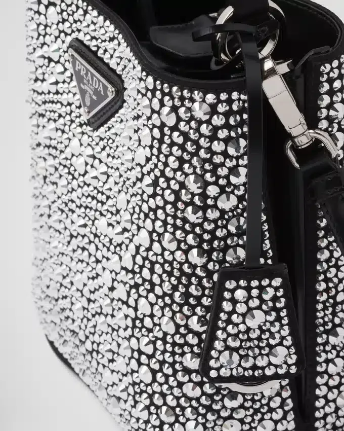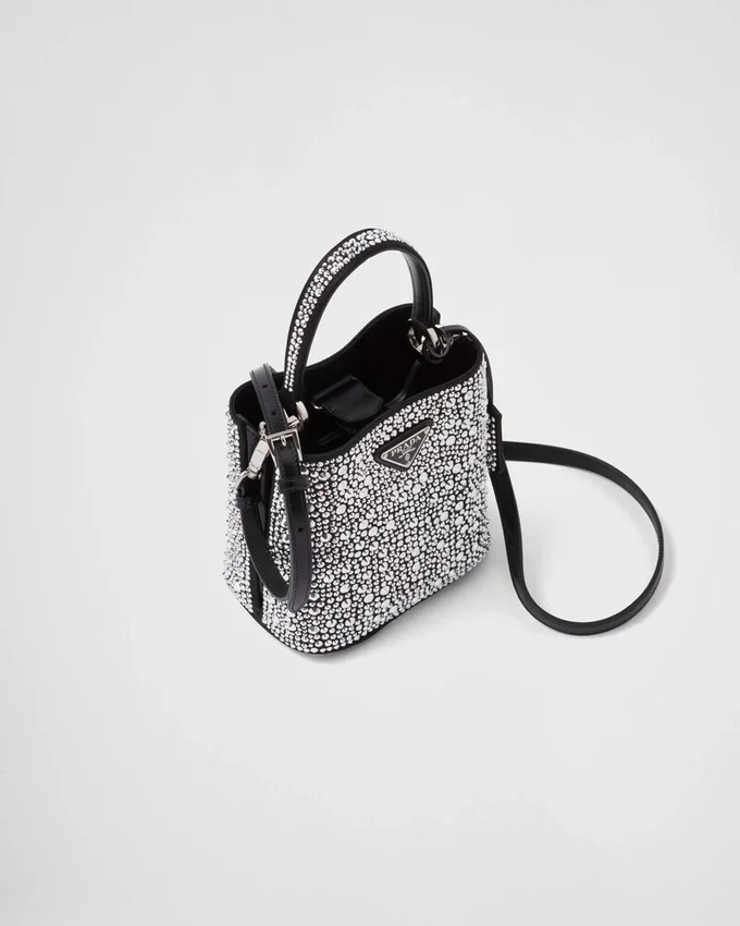 Prada Panier バッグのエレガントなデザインは、ジュエリーの世界を彷彿とさせる、輝きを放つ全面クリスタルによって際立っています。バッグには取り外し可能なショルダーストラップと、メタルロゴをあしらった専用のネームタグが付いています。