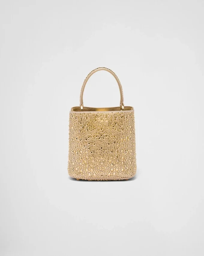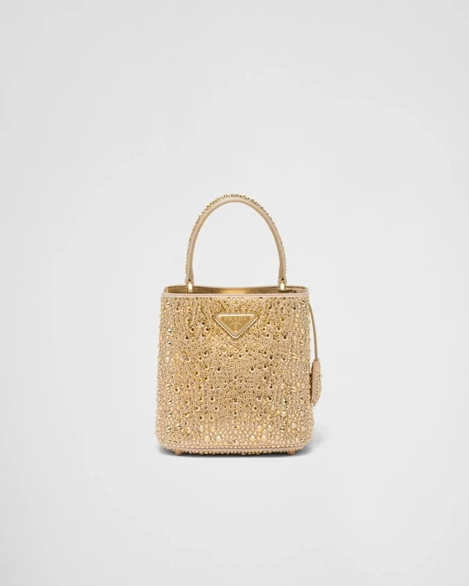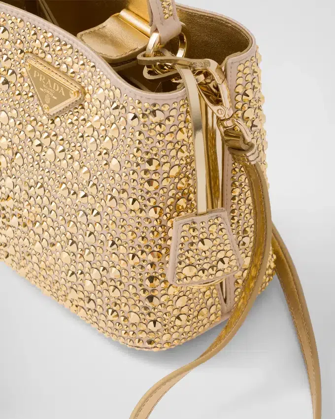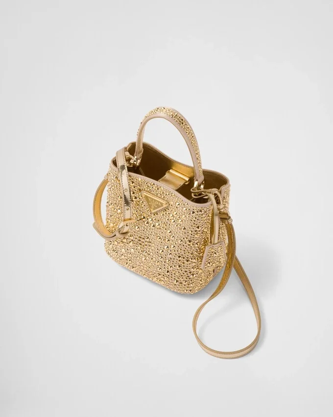 Prada Panier バッグのエレガントなデザインは、ジュエリーの世界を彷彿とさせる、輝きを放つ全面クリスタルによって際立っています。バッグには取り外し可能なショルダーストラップと、メタルロゴをあしらった専用のネームタグが付いています。