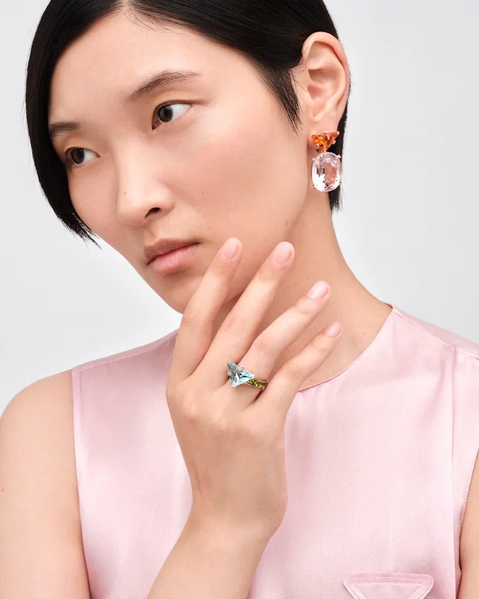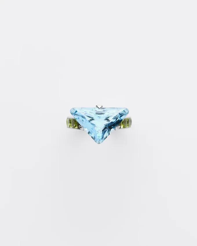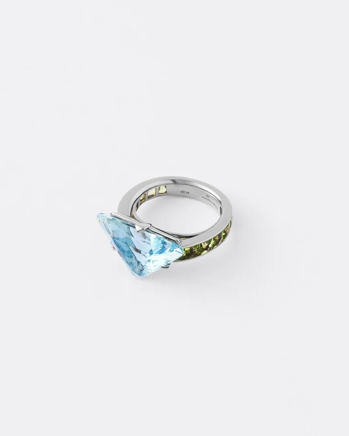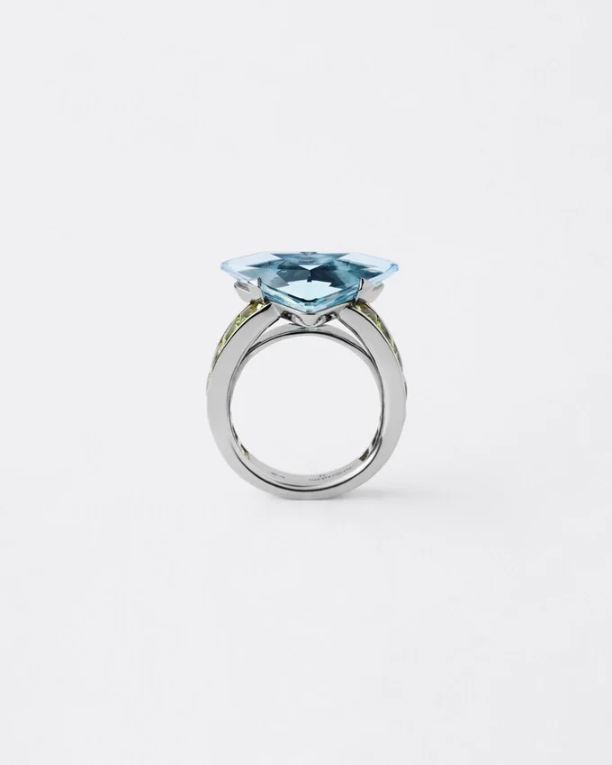 Pradaのファインジュエリー「クーレール・ヴィヴァンテ」コレクションは、鮮やかな色彩、彫刻的なライン、そしてコントラストを追求しています。卓越した色彩美を持つアクアマリンとペリドットを厳選し、Prada独自のカットを施したこのソリテールリングのデザインに組み合わせています。このカットは、ユニークで革新的な形状により、石本来の美しさを引き立てるために開発されました。 この意外性のある組み合わせは、Pradaの魂を反映した、洗練されながらも型破りな色彩表現を提案しています。