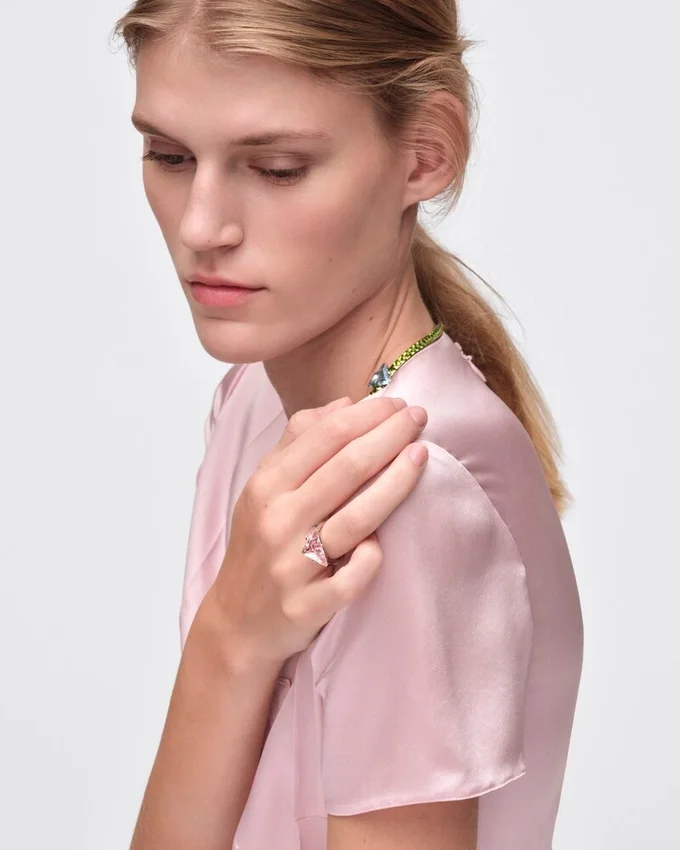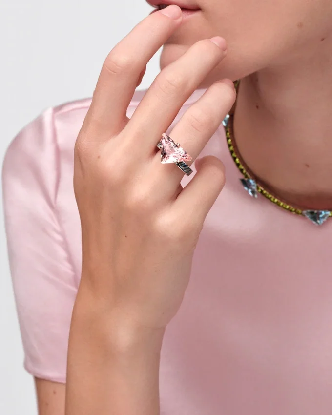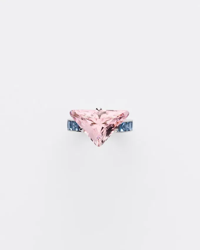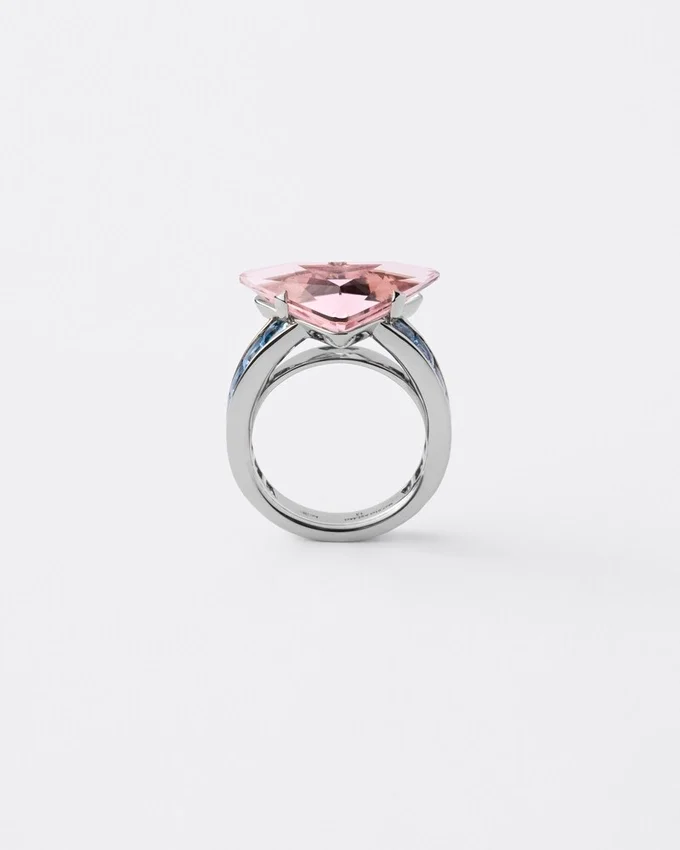 Prada ファインジュエリー「クーレール・ヴィヴァンテ」コレクションは、鮮やかな色彩、彫刻的なライン、そしてコントラストを追求しています。卓越した色彩美を持つモルガナイトとアクアマリンを厳選し、Prada独自のカットを施したこのソリテールリングのデザインに組み合わせています。このカットは、ユニークで革新的な形状により、石の自然な美しさを引き立てるために開発されました。 この意外性のある組み合わせは、Pradaの魂を反映した、洗練されながらも型破りな色彩表現を提案しています。