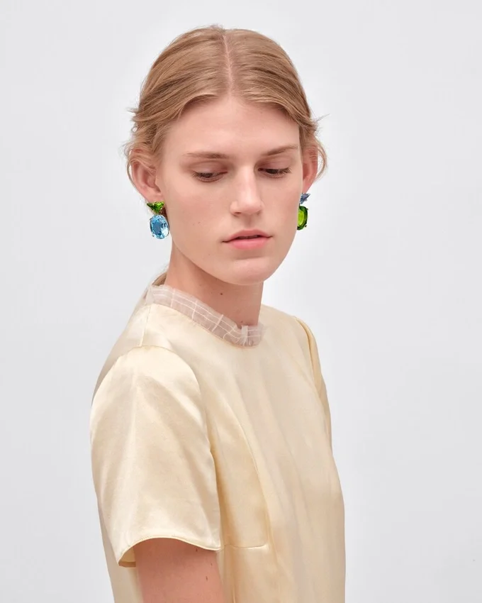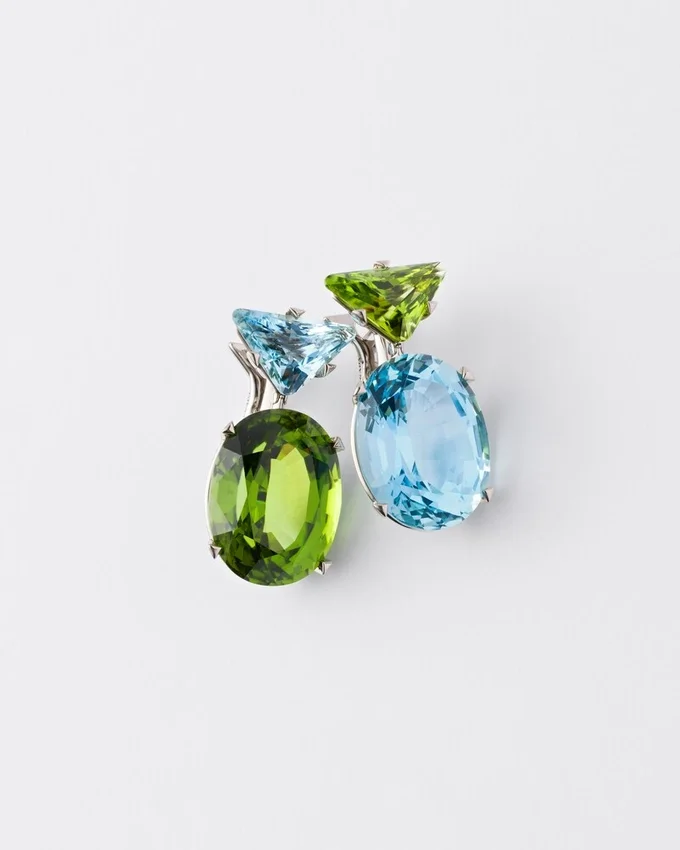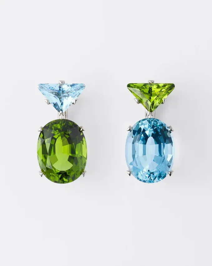 二面性、調和、そしてコントラスト:Prada ファインジュエリー「クーレール・ヴィヴァンテ」コレクションは、色彩の新たな表現を探求しています。この探求は、クラシックなジュエリーの再発見に反映されており、アクアマリンとペリドットのグリーンゴールドの色合いが融合した、このペンダントイヤリングのデザインにインスピレーションを与えています。 Prada特有のカットと、独自のオーバルカットが相まって、石本来の輝きを引き立てています。