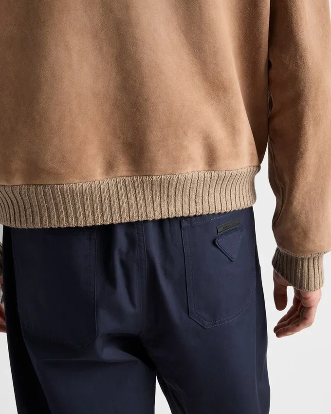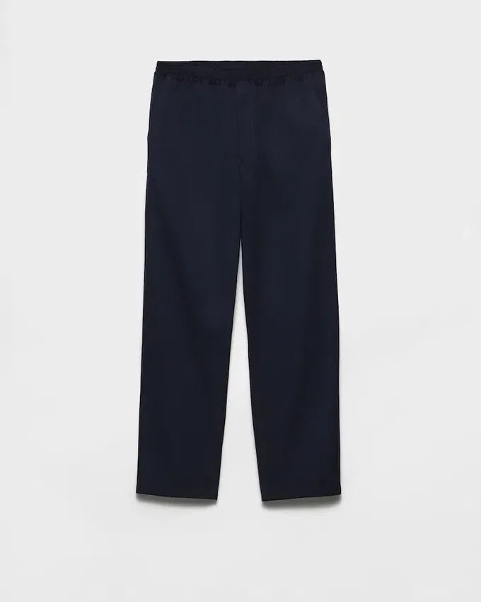 このコットンパンツは、洗練されたカジュアルスタイルとスポーティーなディテールが特徴です。伸縮性のあるウエストが特徴の軽やかなシルエットに、同系色のトライアングルロゴがあしらわれています。