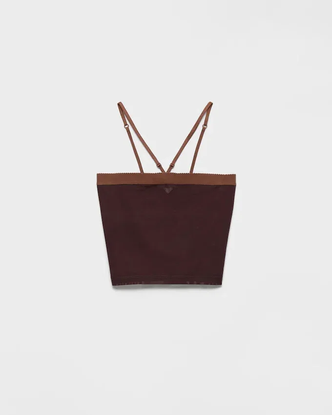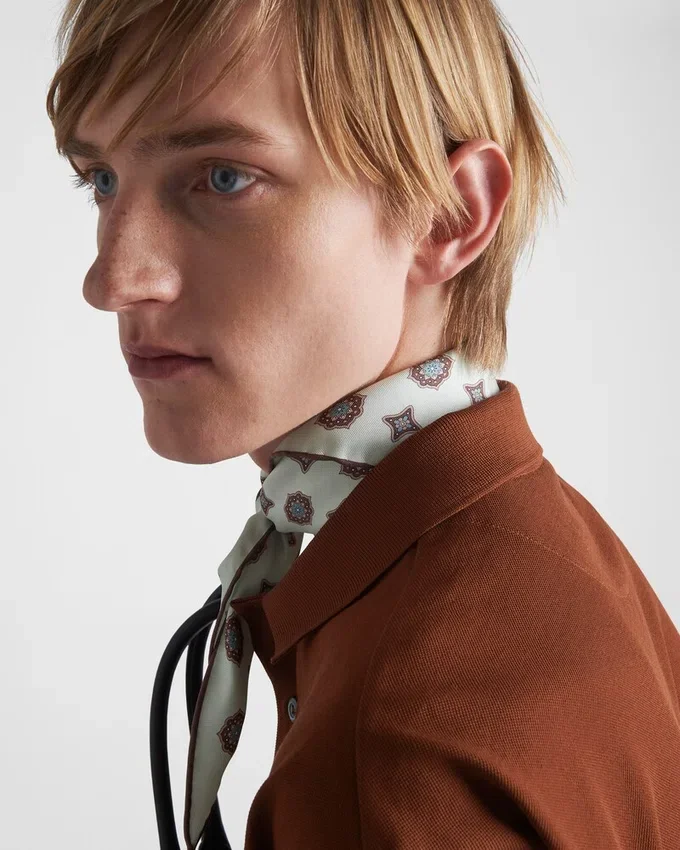 コットンポロシャツは、レイヤリングを施して再解釈され、クラシックなシルエットにモダンでスポーティーな魅力を与えています。オーバーサイズのラインが特徴的な半袖スタイルで、コントラストの効いたジャージートリムがアクセントとなり、象徴的なファブリックの三角ロゴがあしらわれています。