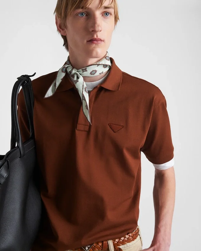 このコットンポロシャツは、レイヤリングを施すことで、クラシックなシルエットに現代的でスポーティーな魅力を吹き込みました。オーバーサイズのラインが特徴的な半袖スタイルで、コントラストの効いたジャージートリムがアクセントとなり、象徴的なファブリックのトライアングルロゴがあしらわれています。