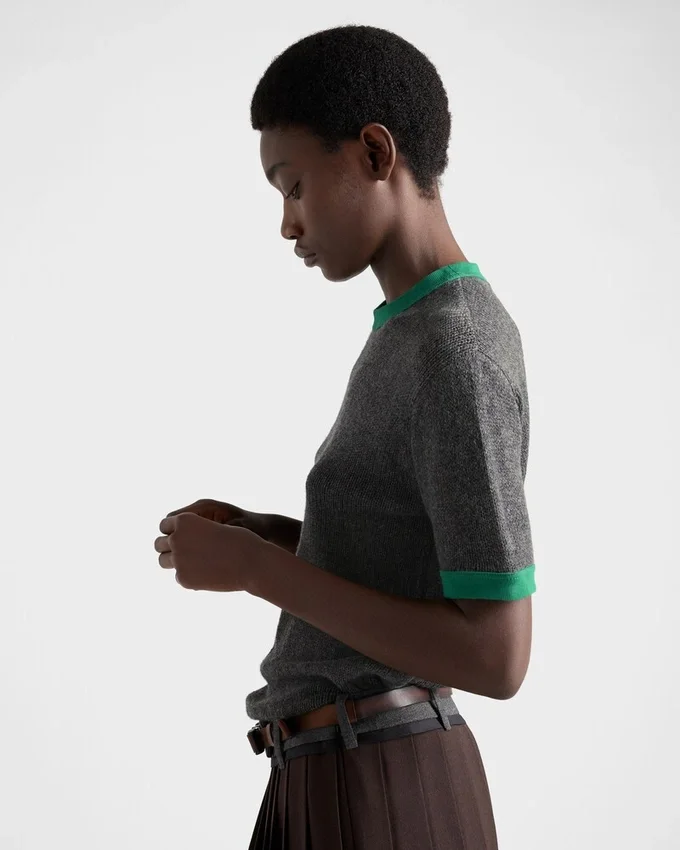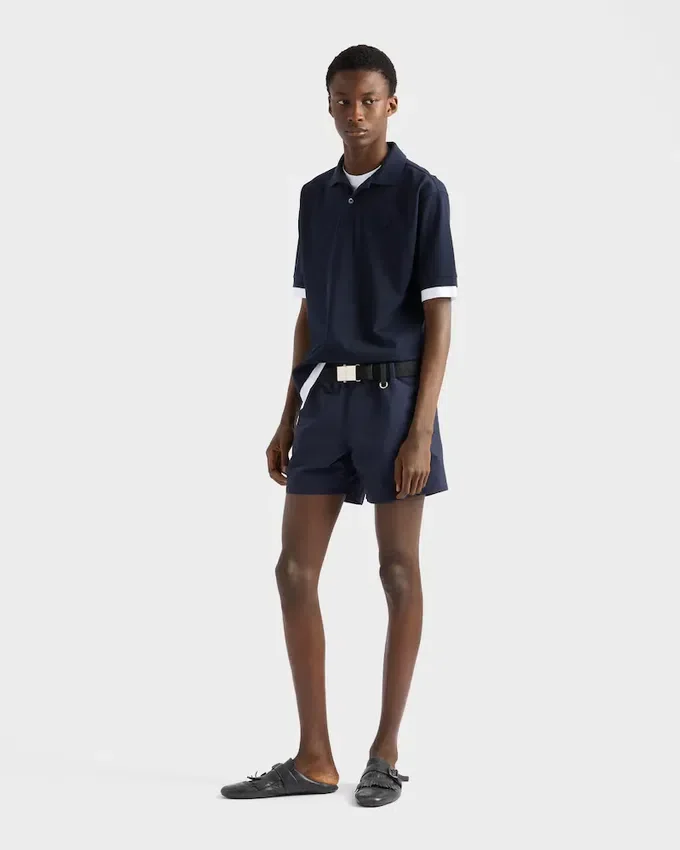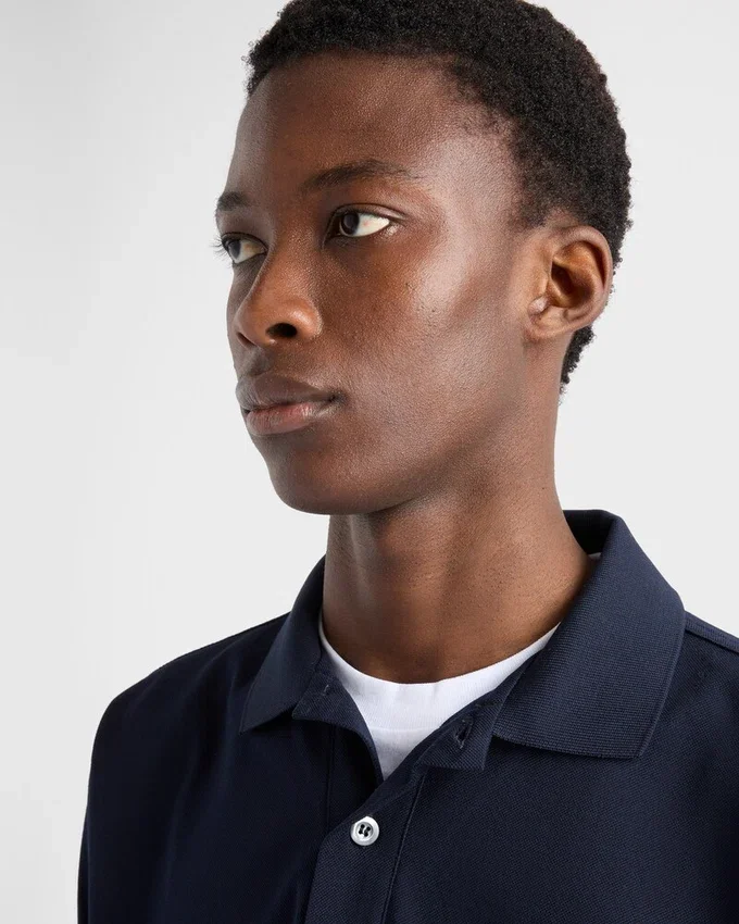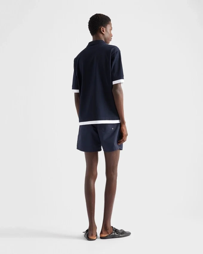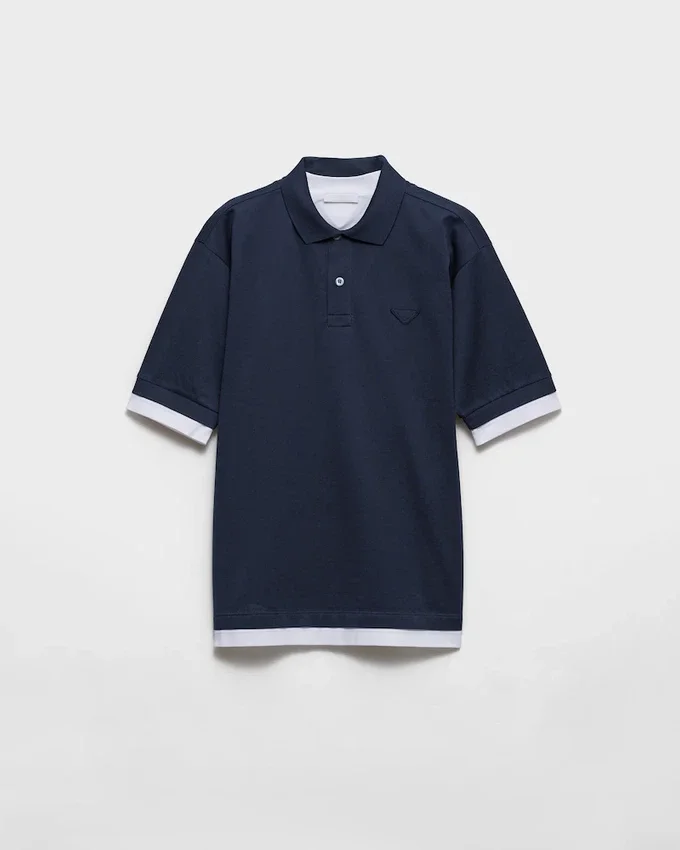 コットンポロシャツは、レイヤードデザインにより、クラシックなシルエットに現代的でスポーティーな魅力を加えた再解釈が施されています。オーバーサイズのラインが特徴的な半袖スタイルで、コントラストの効いたジャージートリムがアクセントとなり、象徴的なファブリックの三角ロゴがあしらわれています。
