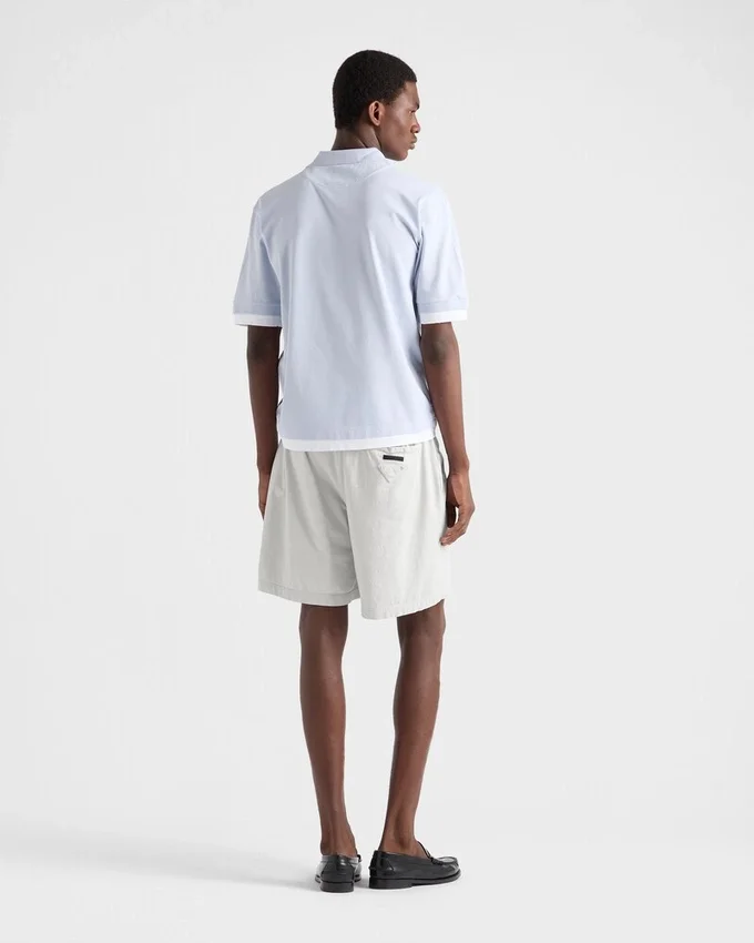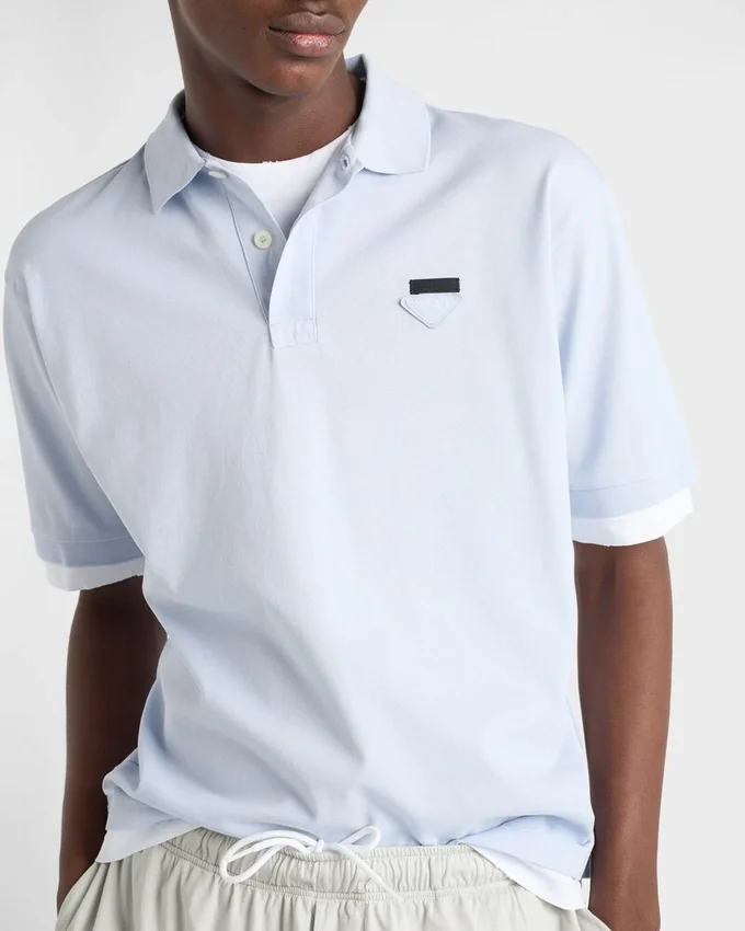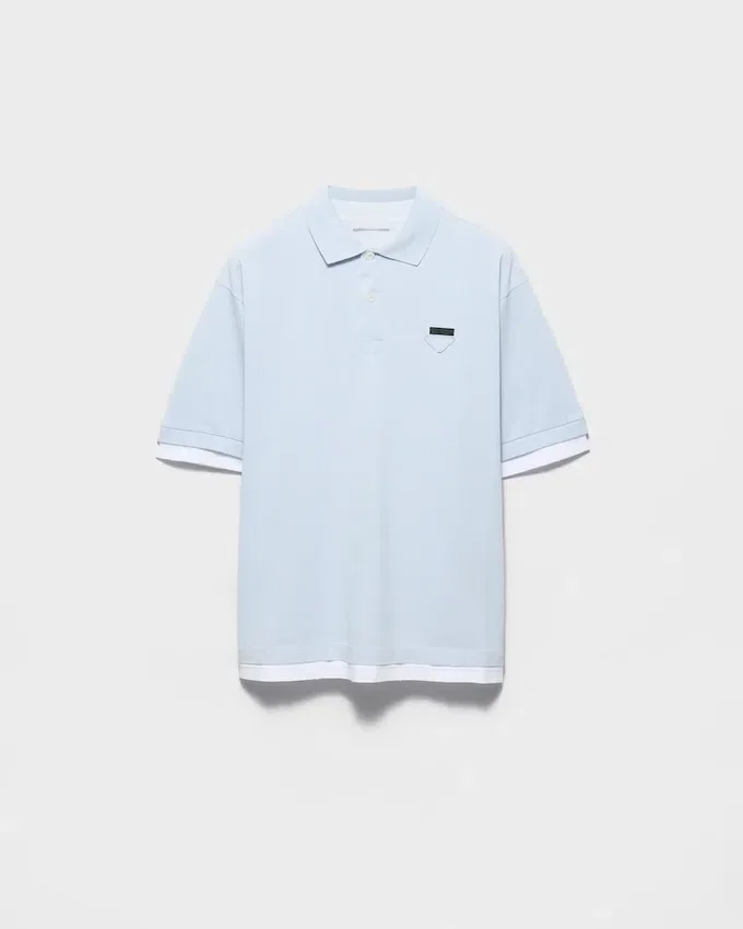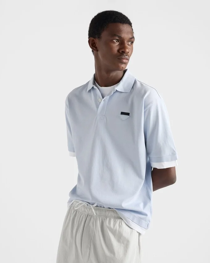 コットンポロシャツは、レイヤリングを取り入れることで再解釈され、クラシックなシルエットにスポーティーで現代的な魅力を加えています。ボックスシルエットが特徴の半袖スタイルは、コントラストの効いたジャージー素材のディテールで彩られ、象徴的なファブリックの三角ロゴがあしらわれています。