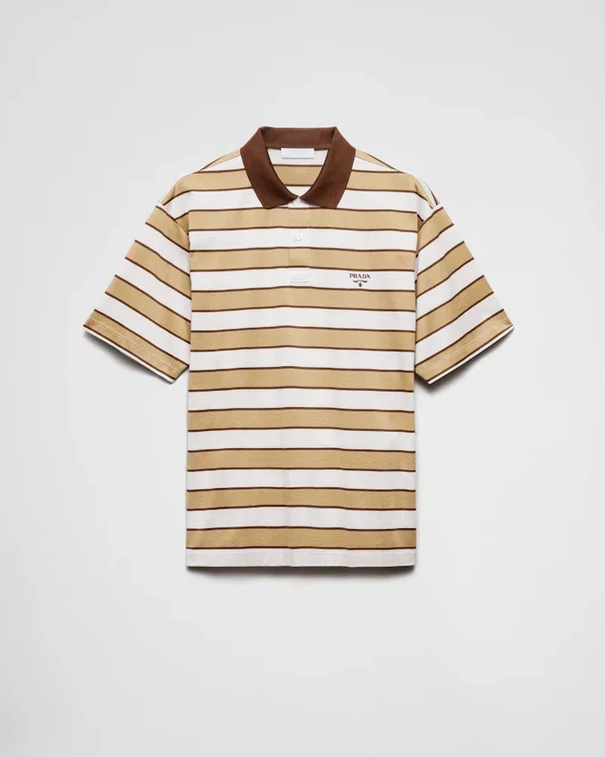 ボックスシルエットが特徴のこのコットンポロシャツは、対照的な色のストライプ柄がアクセントとなり、レタリングロゴがあしらわれています。