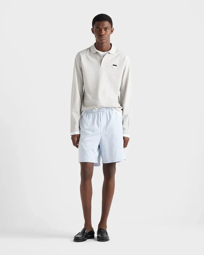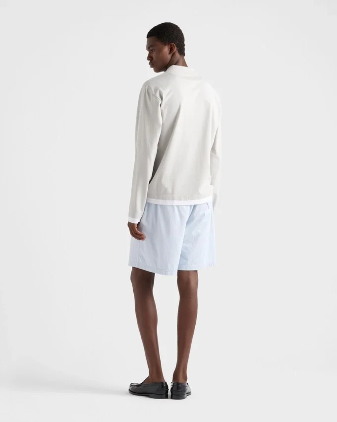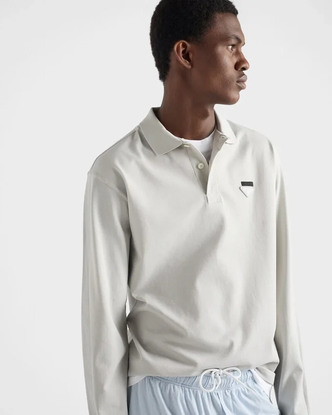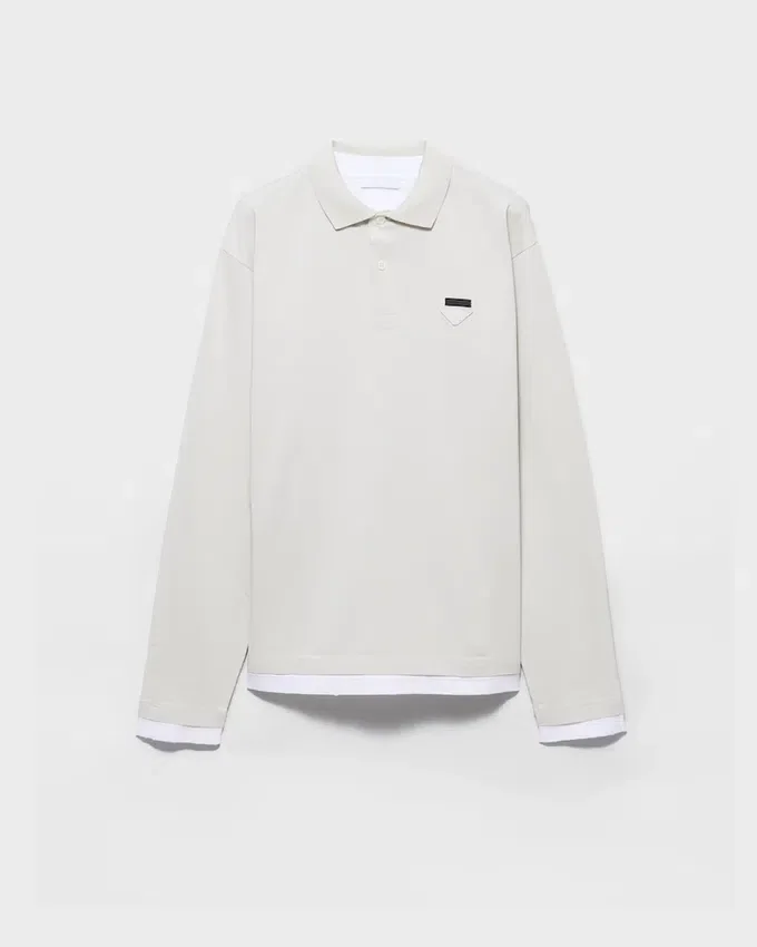 このコットンポロシャツは、レイヤードデザインにより再解釈され、クラシックなシルエットにスポーティーで現代的な魅力を加えています。ボックスシルエットが特徴のロングスリーブスタイルは、コントラストの効いたジャージー素材のディテールで彩られ、象徴的なファブリックの三角ロゴがあしらわれています。