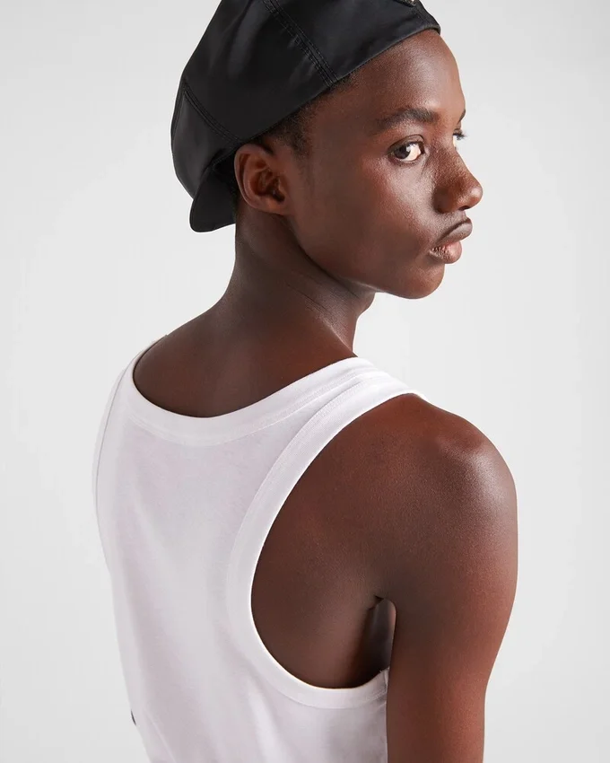 このスキニーフィットのコットンタンクトップは、ブランド特有のミニマルなエレガンスを特徴としています。 前面にはエナメル加工されたメタル製のトライアングルロゴが際立っています。