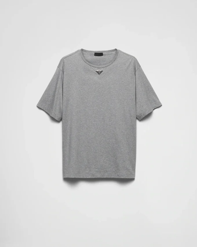 この柔らかなコットンTシャツは、ミニマルなシルエットとオーバーサイズフィットが特徴です。半袖スタイルには、象徴的なエナメル加工の金属製トライアングルロゴがあしらわれています。