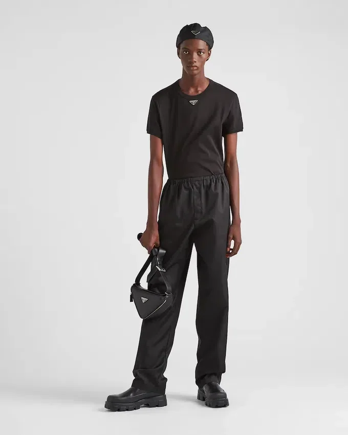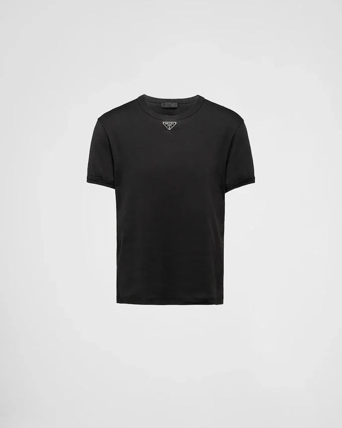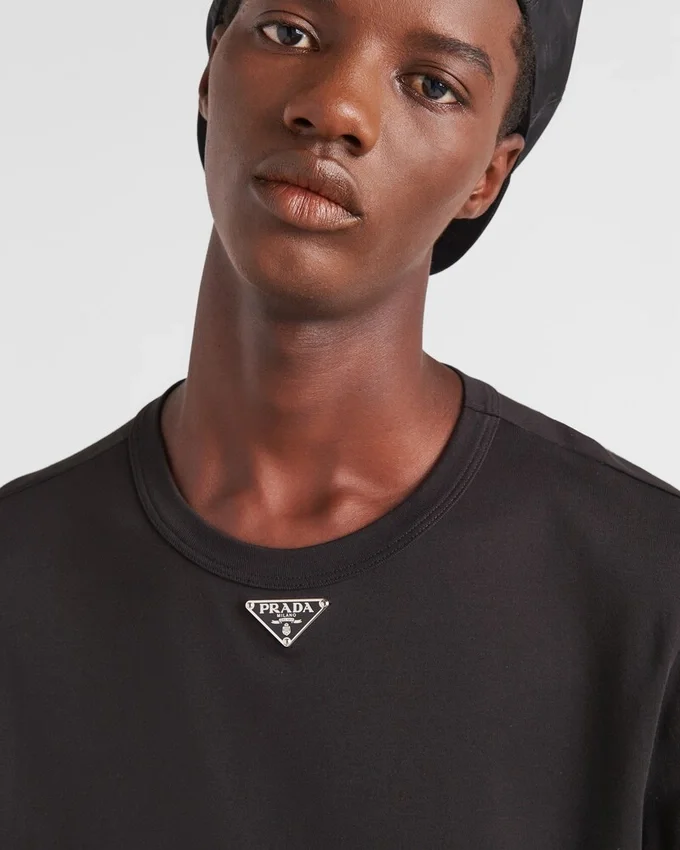 この半袖コットンTシャツは、スキニーフィットで、リブ編みのクルーネックが特徴です。前面には、象徴的なエナメル加工の金属製トライアングルロゴがあしらわれています。