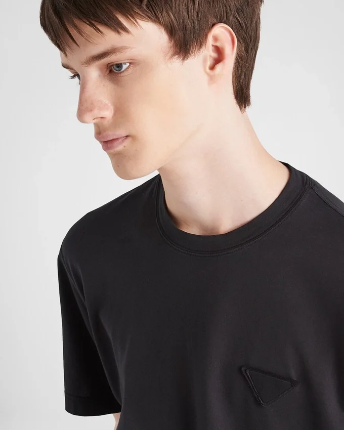 この半袖コットンTシャツは、オーバーサイズフィットで、リブ編みのクルーネックが特徴です。フロントには象徴的なトライアングルロゴがあしらわれています。