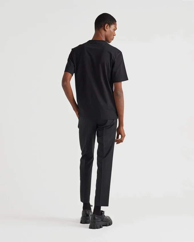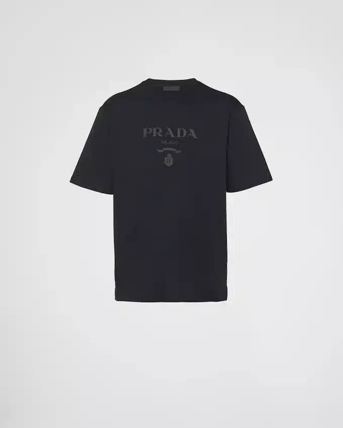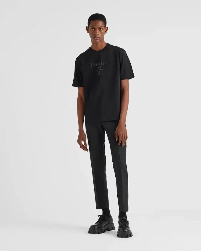 ブランドのエッセンシャルズアイテムであるPradaのジャージーTシャツは、シンプルさの中に贅沢さを体現し、それは一種の姿勢となり、基本を再構築し新たな意味を提案する探求へとつながります。デザインには、シリコン素材で表現されたブランドの象徴的なレタリングロゴがアクセントとして施されています。