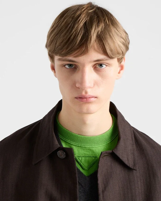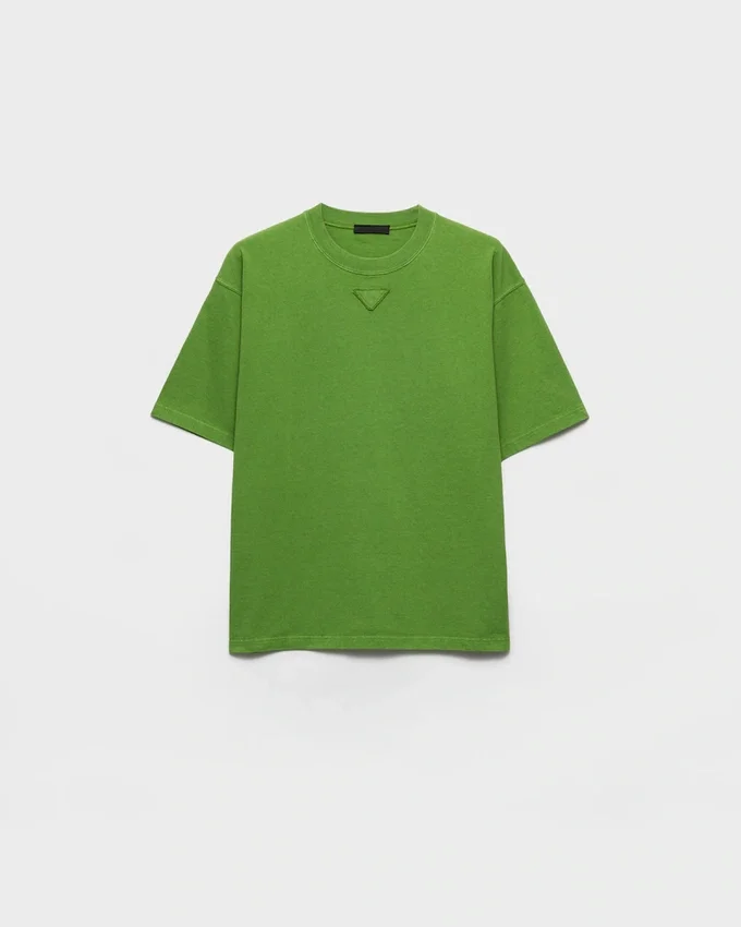 このコットンTシャツはボックスシルエットで、クルーネック仕様です。同系色の三角形ロゴの幾何学的な形状が、シンプルなデザインに独特なスタイルを加えています。