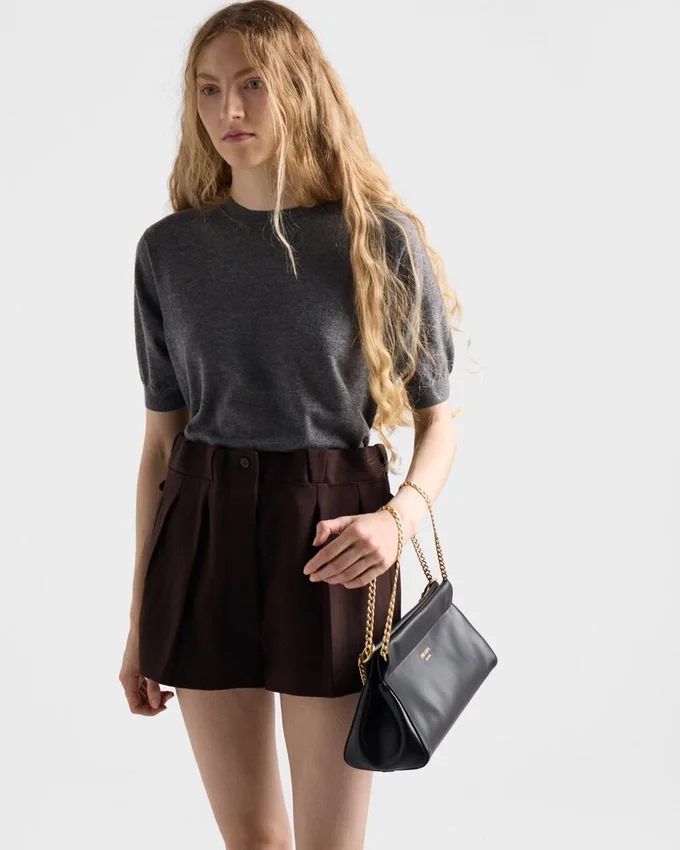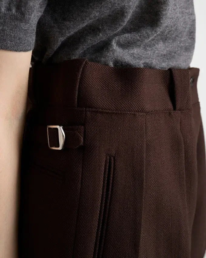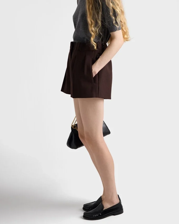 シェブロンウールを使用したこのショーツは、ワイドなシルエットとリラックスしたフィット感が特徴です。新しいプロポーションと柔らかなラインが、現代的な仕立ての優雅さを際立たせています。