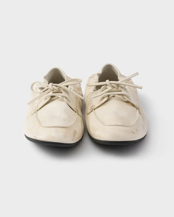 フォーマルなスタイルを備えたクラシックなボートシューズが、革新的かつ完全にデコンストラクトされたデザインで再解釈されました。このレースアップシューズは、軽やかで柔らかく、しなやかなシルエットを重視した靴作りの進化を体現しています。ヴィンテージ風のアンティーク加工が施されたレザーを使用し、洗練されたラインを持つこれらのボートシューズには、上品なレタリングロゴがあしらわれています。