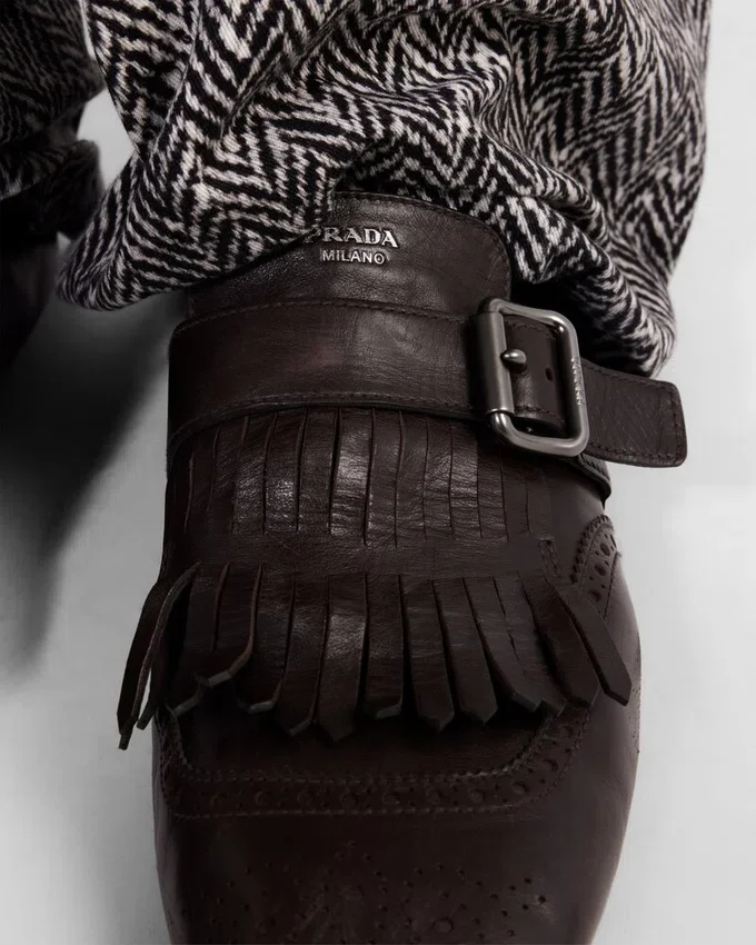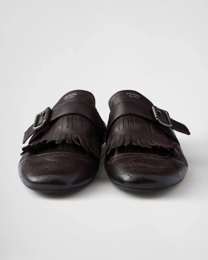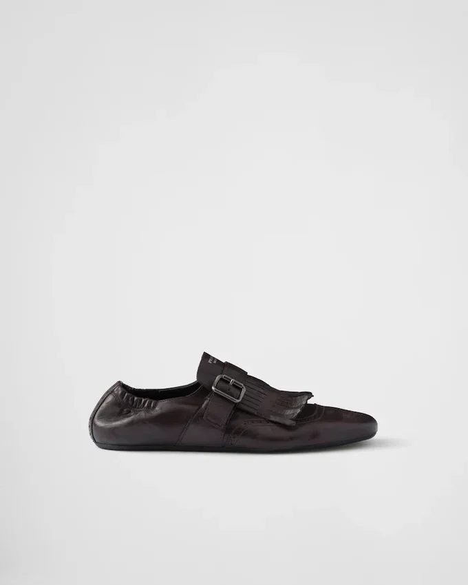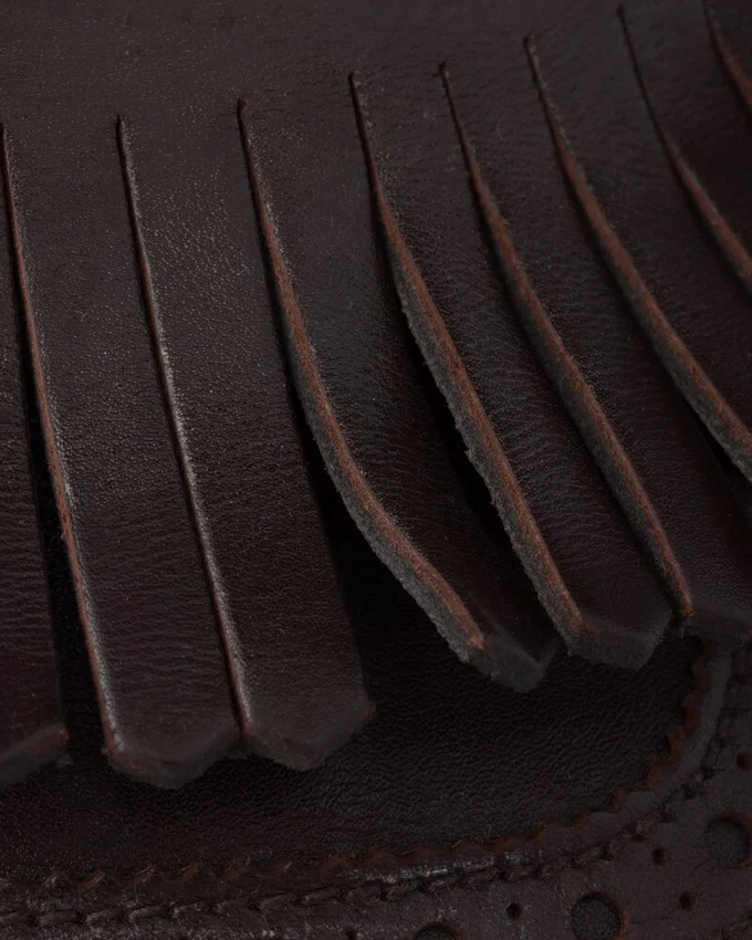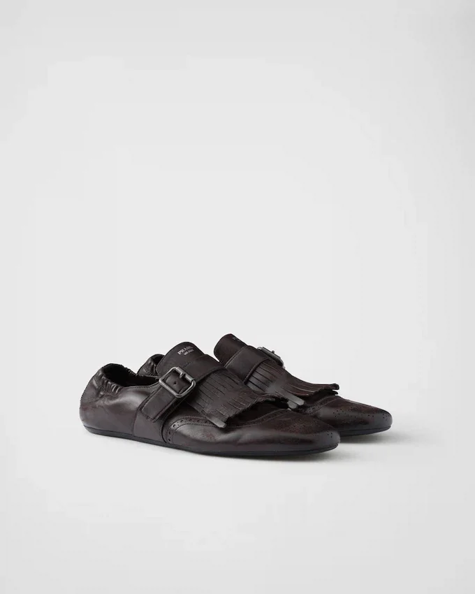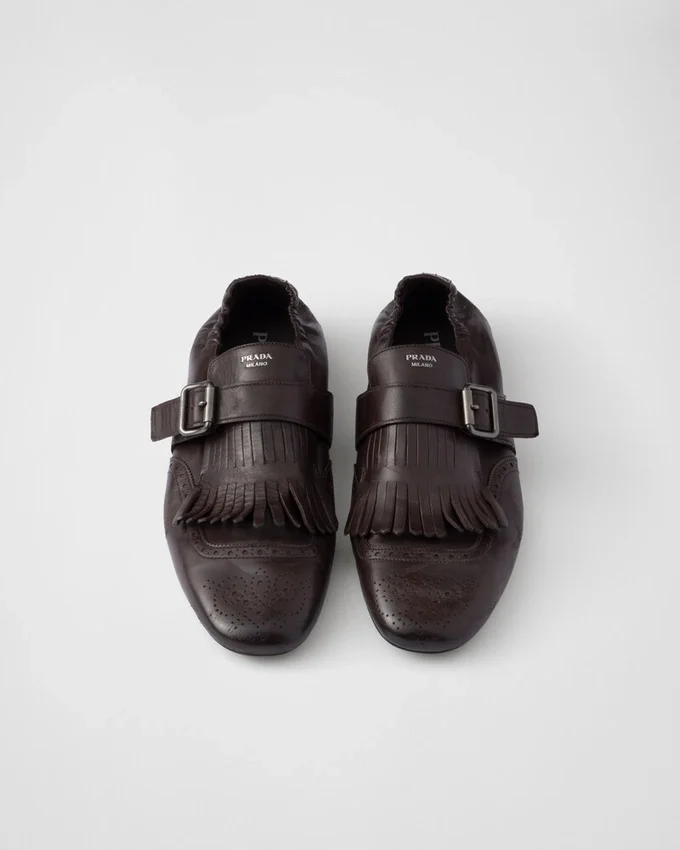 メンズフォーマルシューズを、柔らかくしなやかなデコンストラクテッドシルエットで再解釈しました。ヴィンテージ加工を施したこのモンクストラップレザーシューズは、フリンジとクラシックなブローグモチーフで彩られ、薄底がデザインの革新的で現代的な美学を引き立てています。