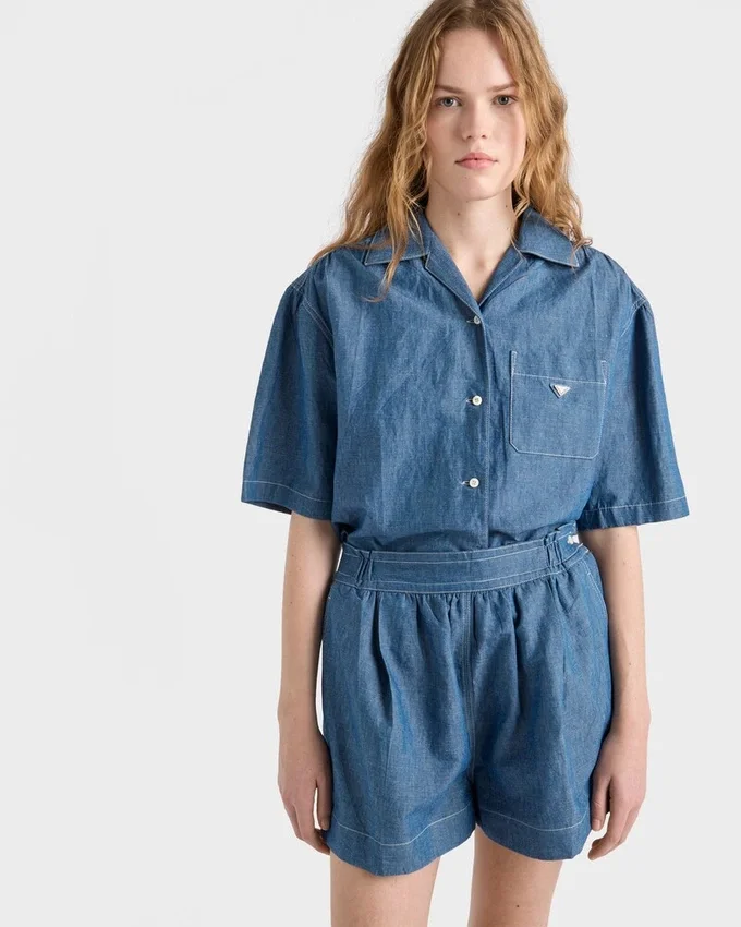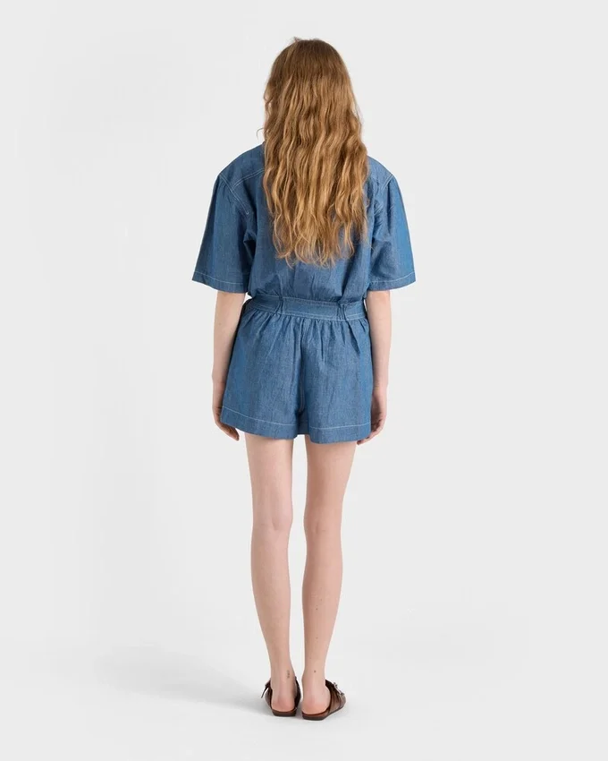 ワークウェアを、現代的なラインと洗練されたディテールを通じてミニマルに再解釈しました。ボックスシルエットのこの半袖ジャンプスーツは、シャンブレー生地を使用しており、軽量でありながら洗練された美しさを際立たせています。
