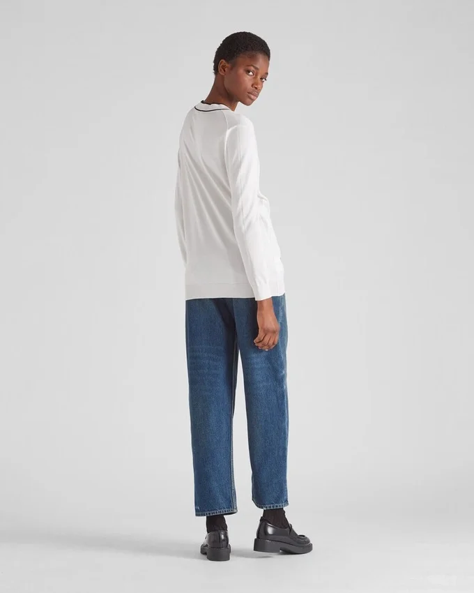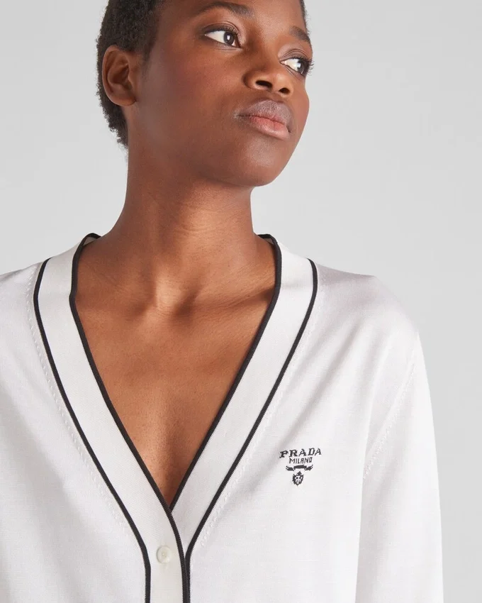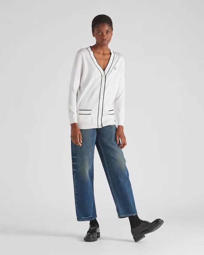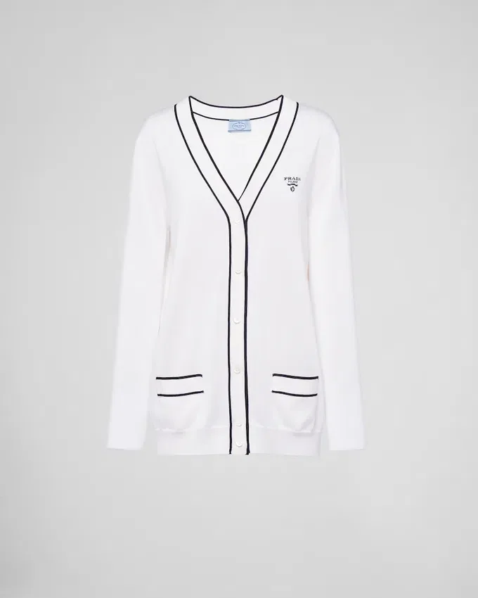 エレガントな編み技術により、この上質なシルクカーディガンの縁取りに繊細な色のコントラストが生まれています。ポケットとネックラインのラインが、象徴的なインタルシア文字ロゴをあしらったこのアイテムを引き立てています。