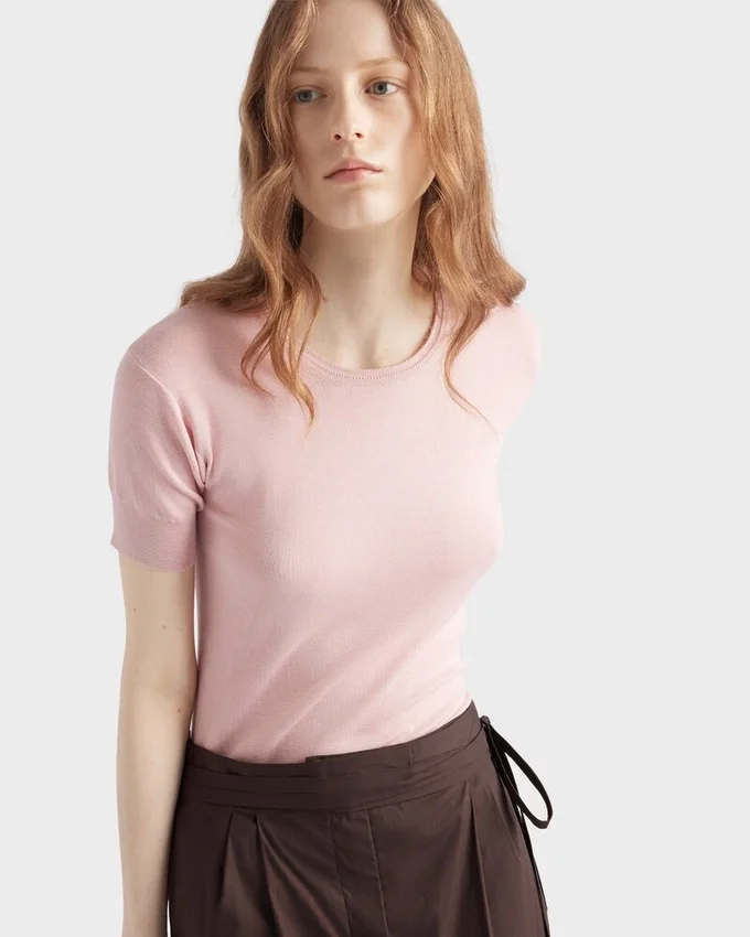 Pradaの定番アイテムであるこのシルク&コットン製半袖セーターは、洗練されたシルエットが特徴です。 リブ編みのクルーネック、袖口と裾のトリムが特徴のこの半袖スタイルは、同系色のトライアングルロゴで仕上げられています。