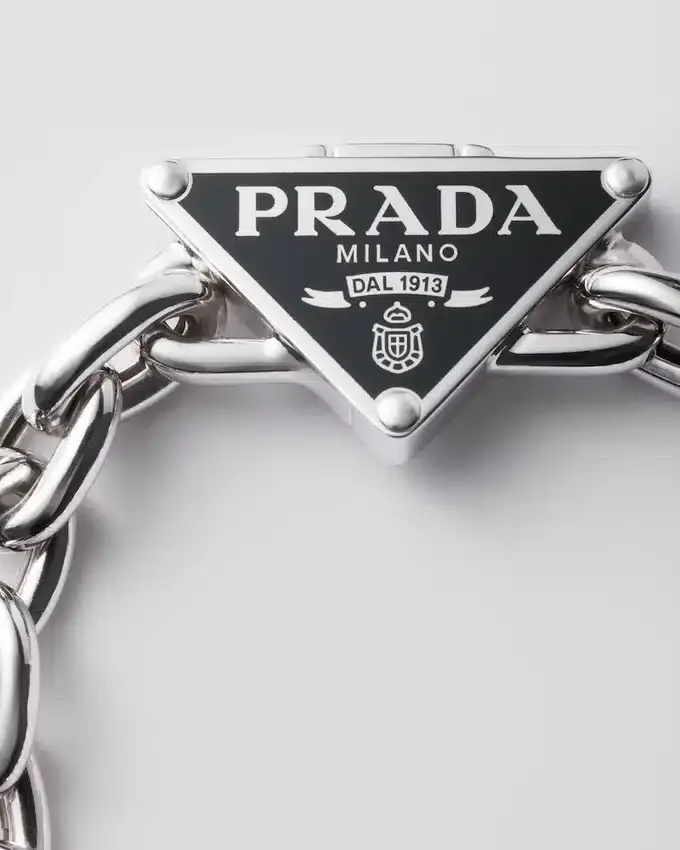 Prada Triangleが、パラジウム仕上げの925スターリングシルバー製で、スリムなデザインが特徴のこのチェーンブレスレットを引き立てています。