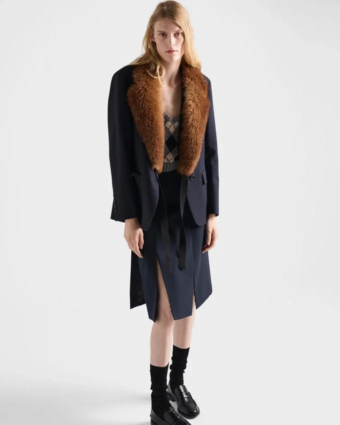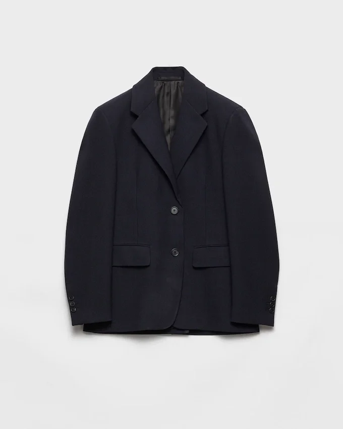 洗練されたシルエットと洗練されたディテール。厳格なストレートカットと柔らかな生地を組み合わせたこのシングルブレストのラッシュステッチジャケットは、ノッチラペル、フラップポケット、そしてスタイルにPrada Triangleロゴを加え、Pradaならではのアクセントを加えるシェットランドウール製のロゴが特徴です。