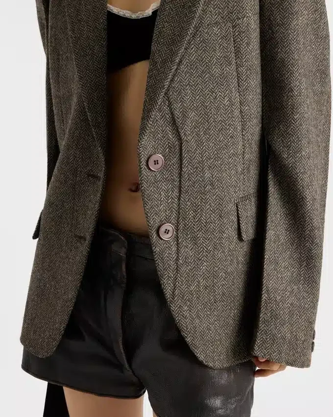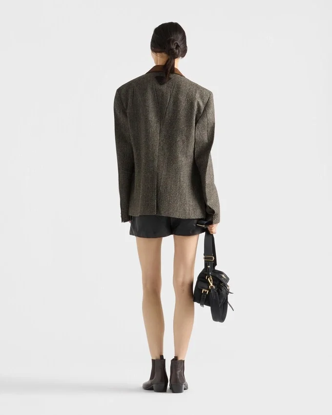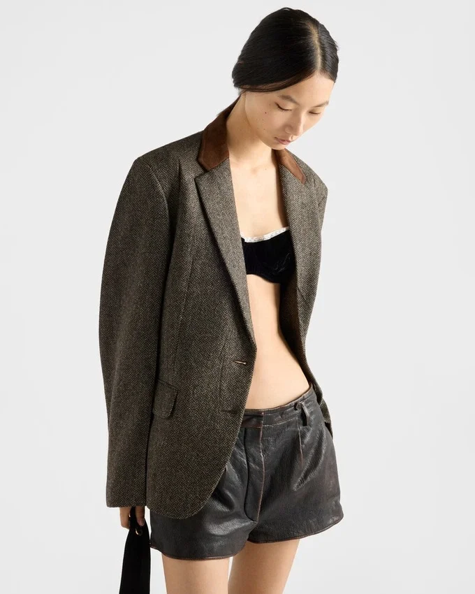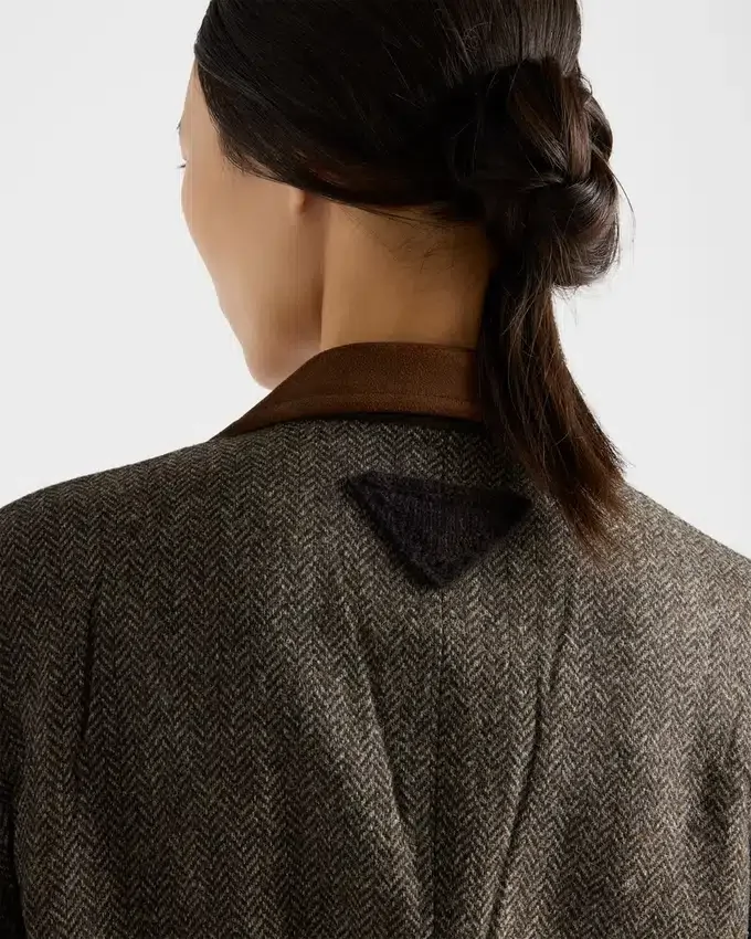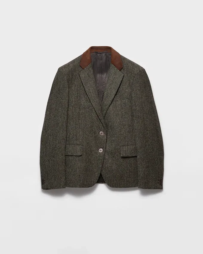 洗練された冬の質感が、このジャケットにレトロな魅力を添えています。シェットランドウールを使用したシェブロン柄のこのジャケットは、スエードのインサートが施されたクラシックなラペルと、男性的なシルエットが特徴です。